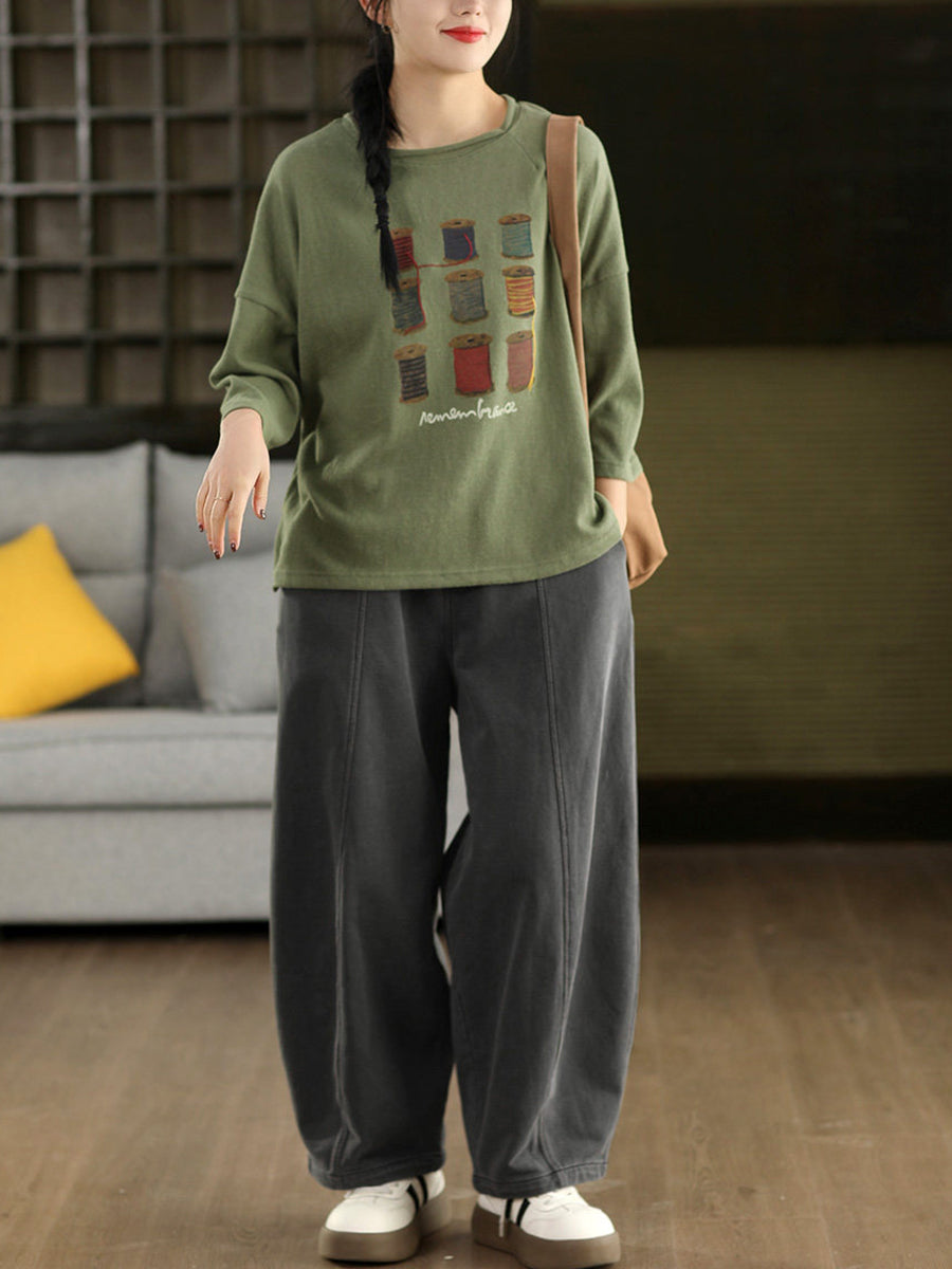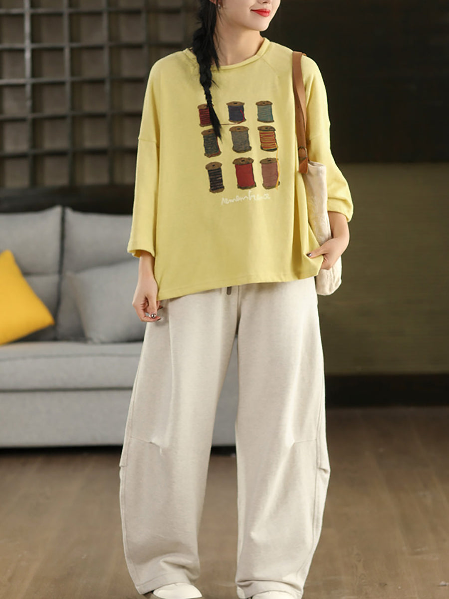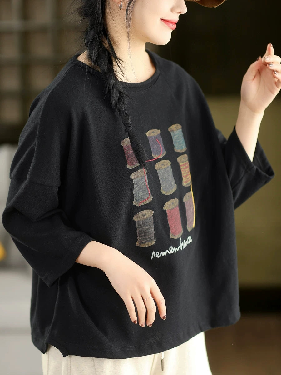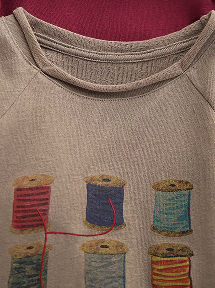 Blusa feminina de algodão com estampa artística e gola redonda, estilo primavera.