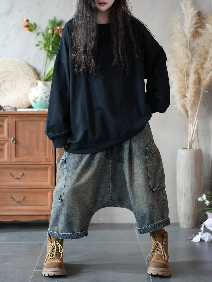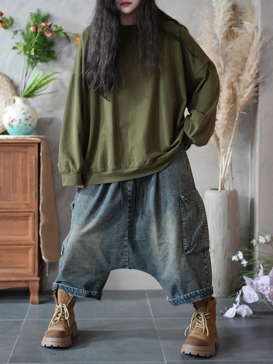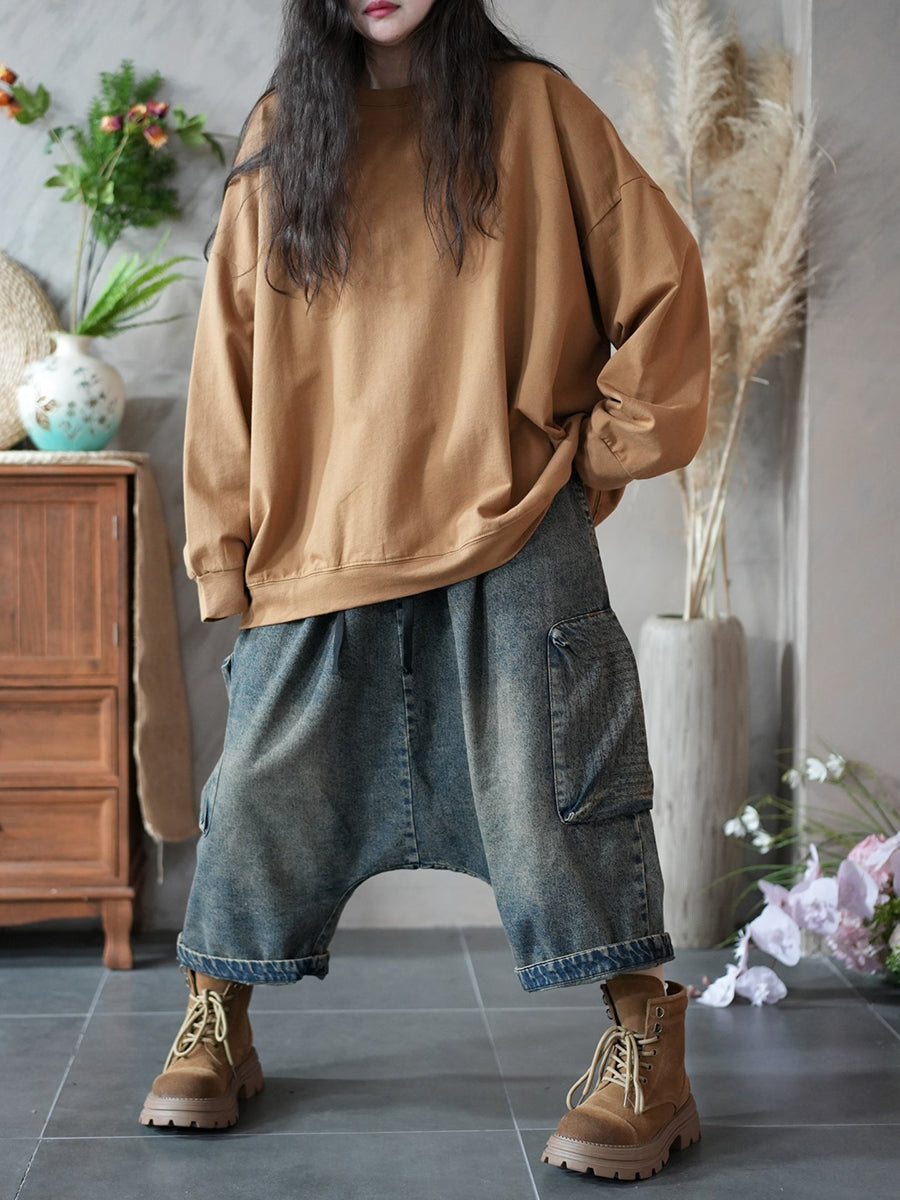 Blusa feminina de algodão 100% com decote redondo, estilo artístico e cor lisa para a primavera.