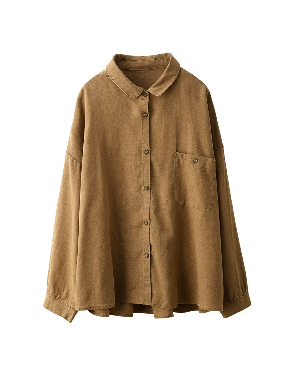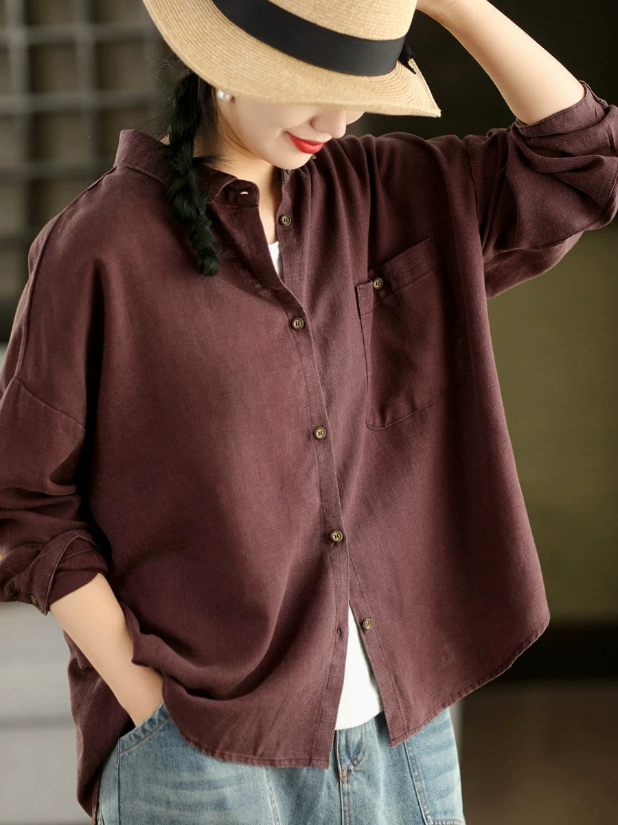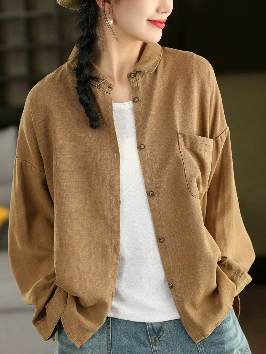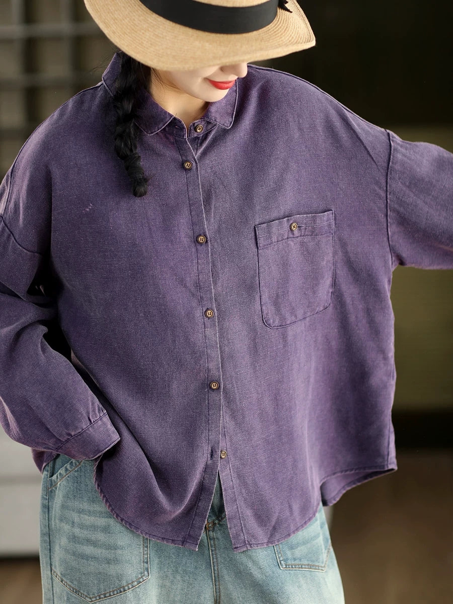 Camisa feminina de linho 100% com estampa artística de primavera em cores puras.