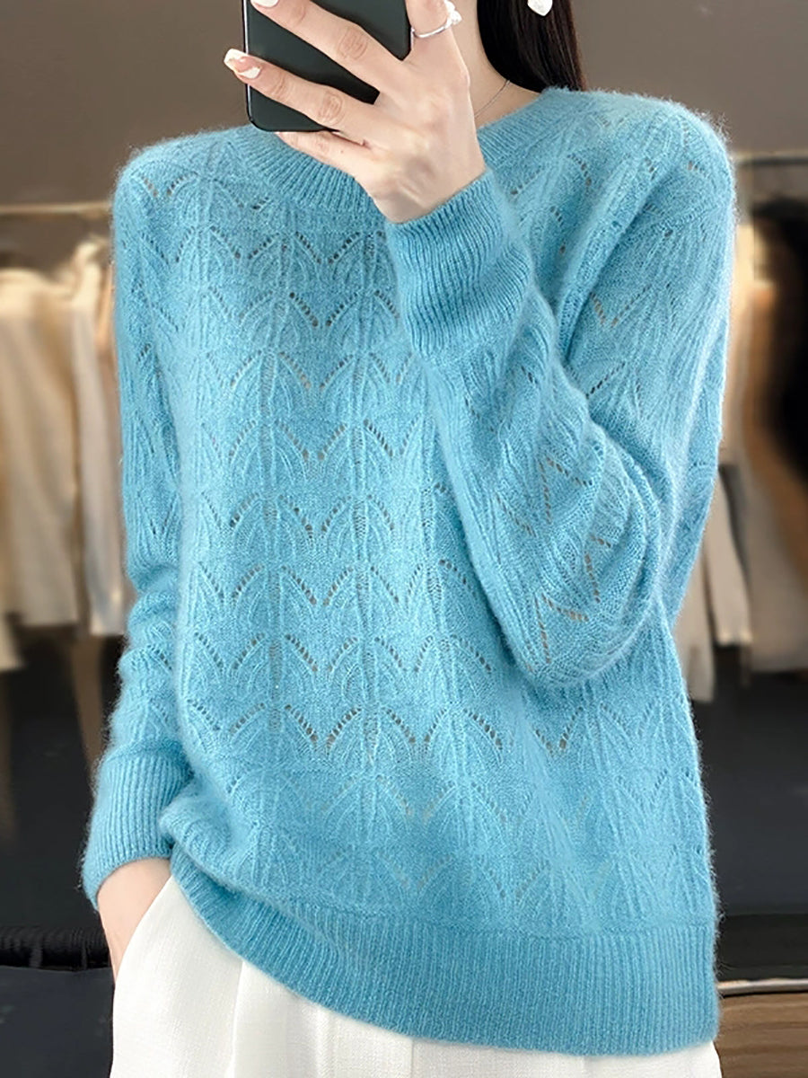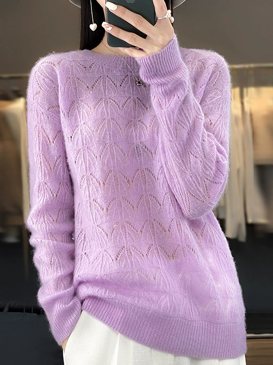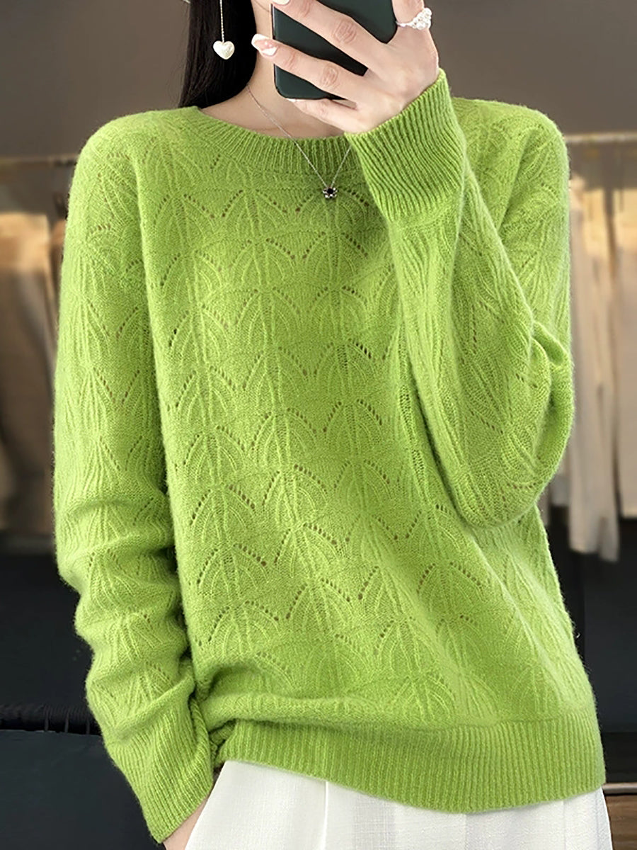 Suéter feminino de lã com gola redonda, cor lisa e estilo artístico para a primavera.