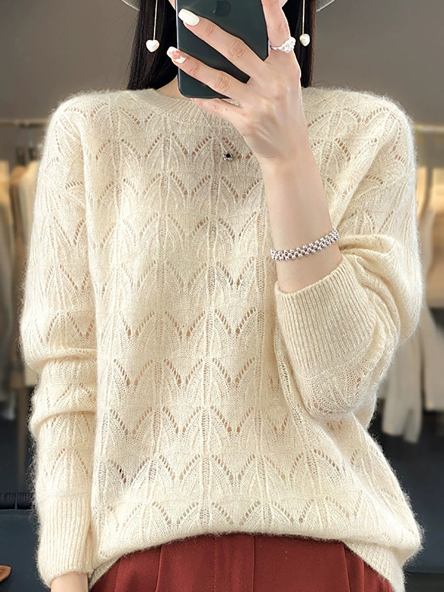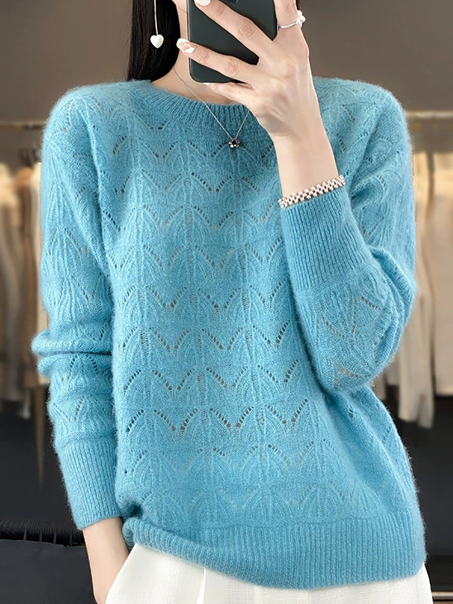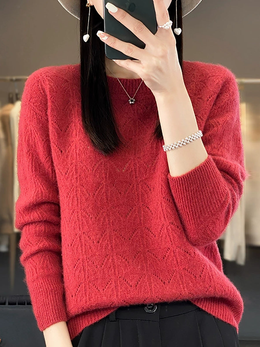 Suéter feminino de lã com gola redonda, cor lisa e estilo artístico para a primavera.