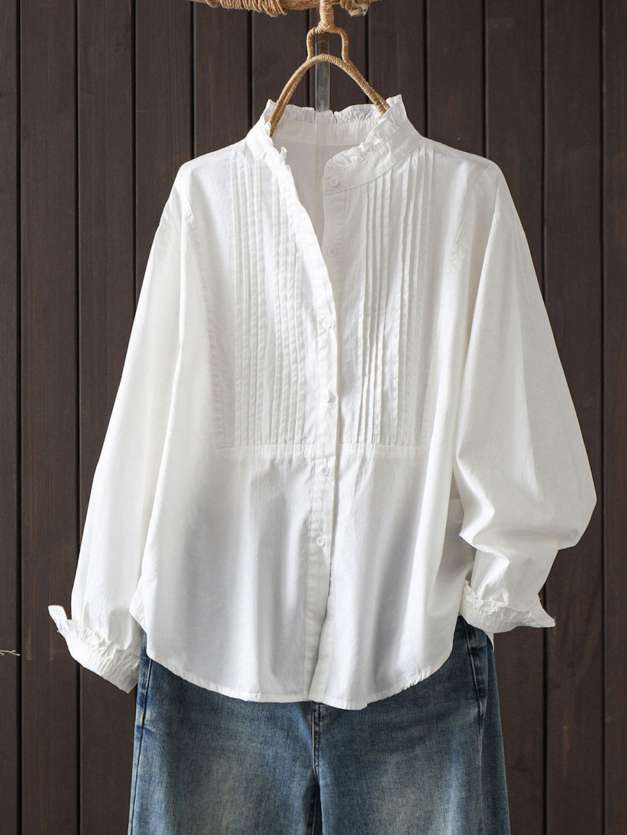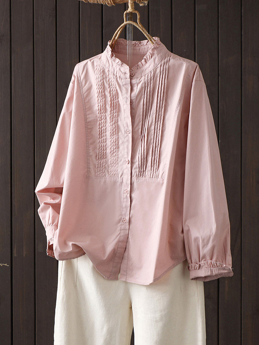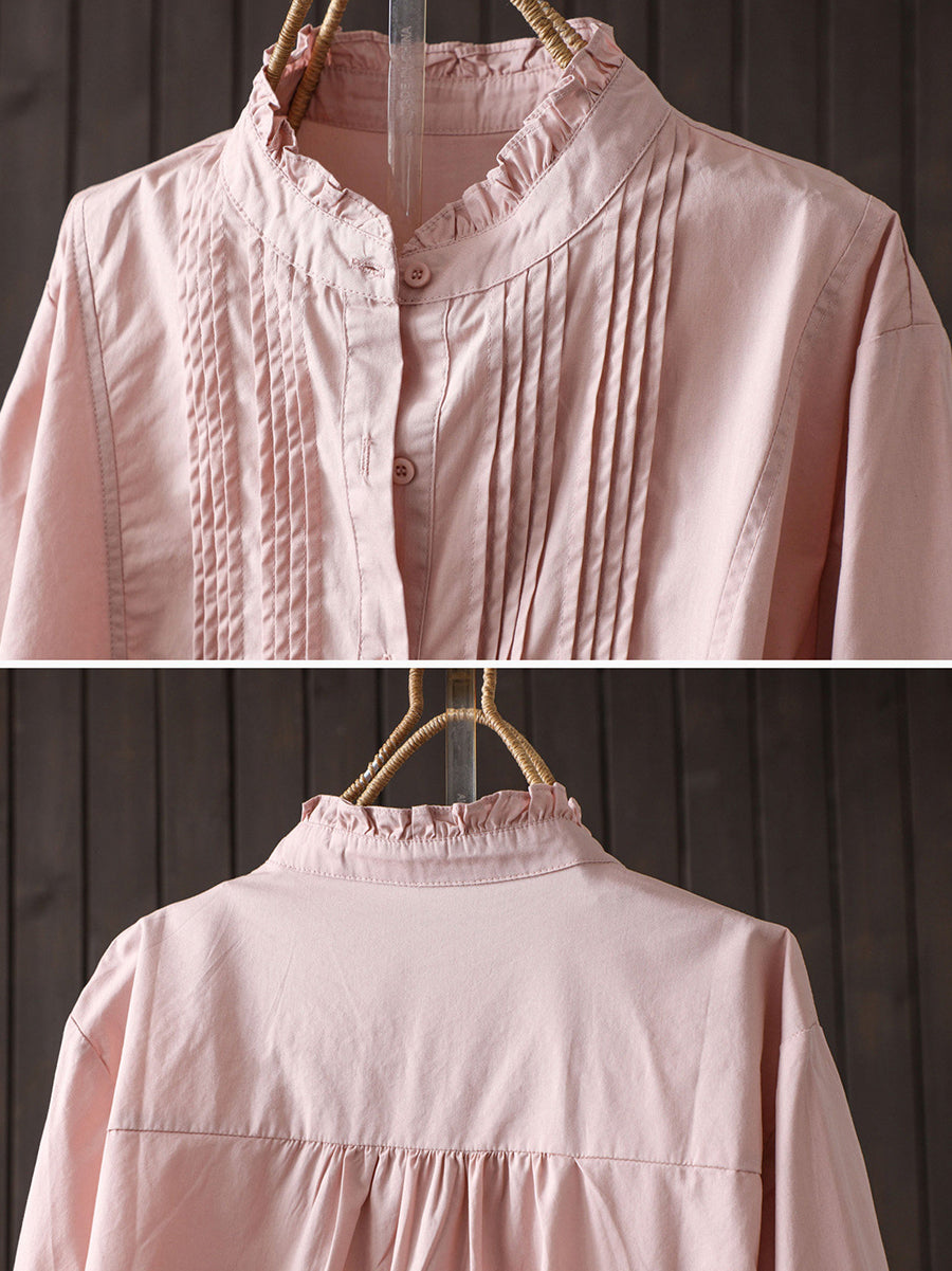 Camisa feminina de algodão 100% com franzido, estilo artístico, cor lisa, para a primavera.