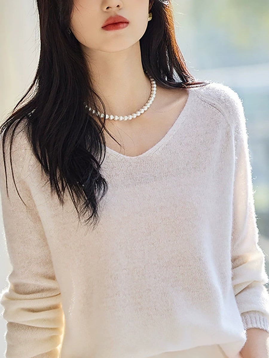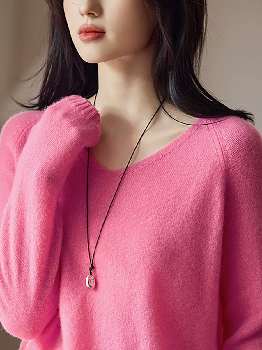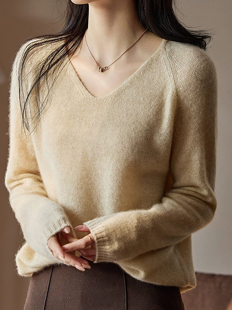 Suéter feminino de lã com decote em V, cor lisa e estilo artístico para a primavera.