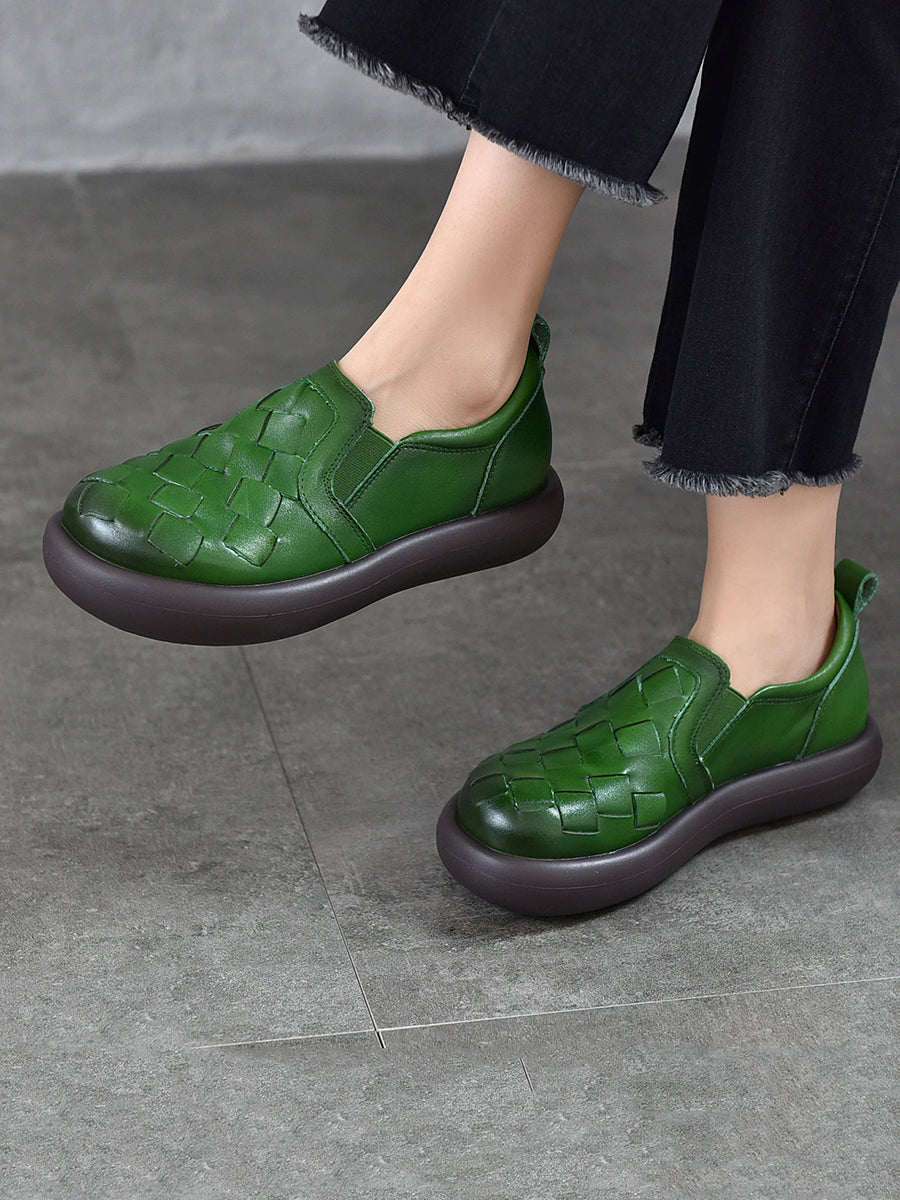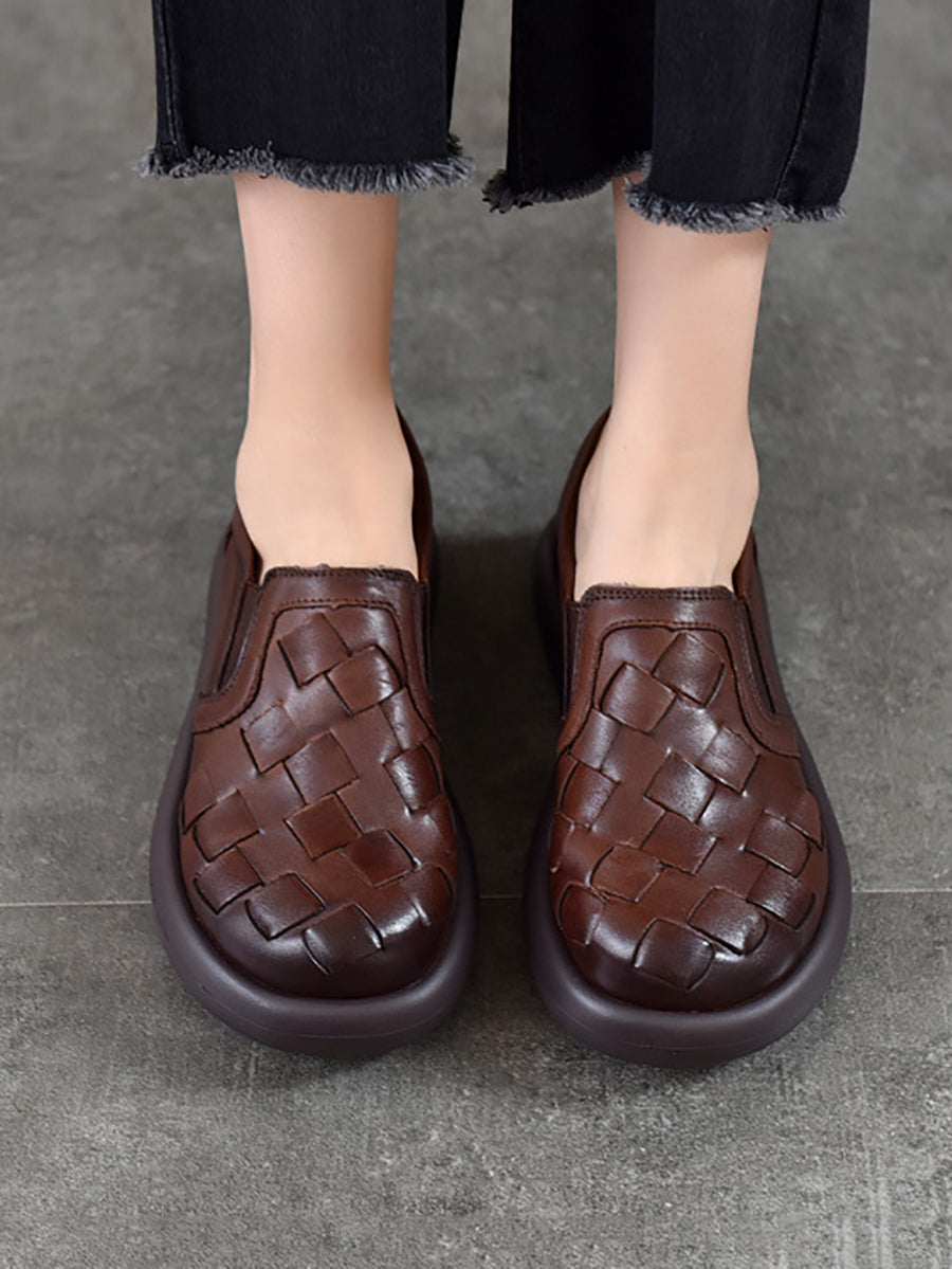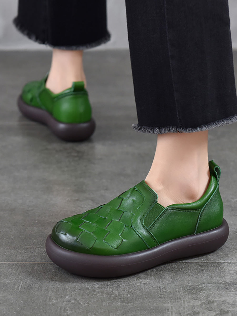 Sapatos femininos casuais de primavera em couro legítimo trançado, modelo rasteiro.
