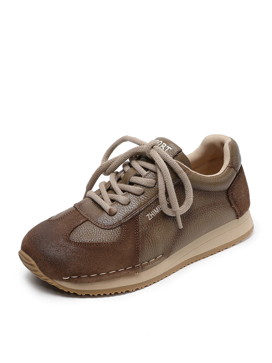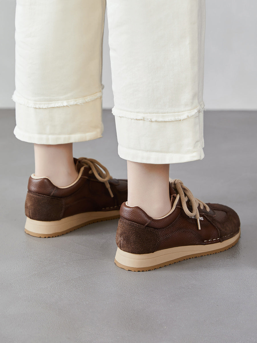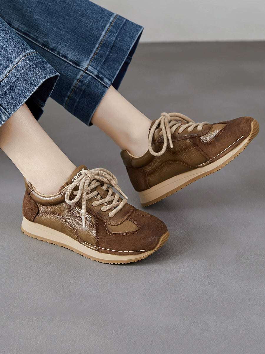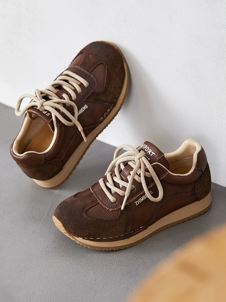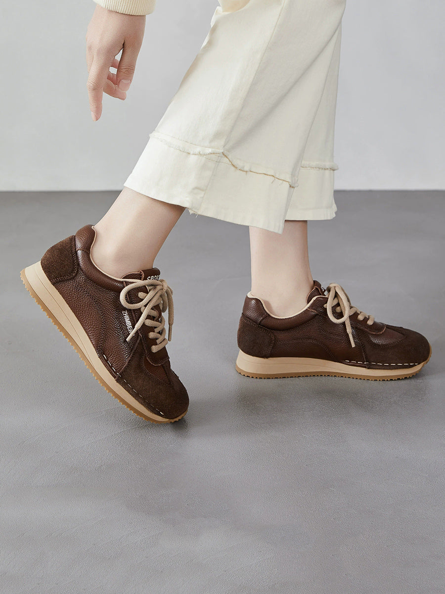 Tênis esportivo feminino de primavera em couro legítimo com detalhes em patchwork