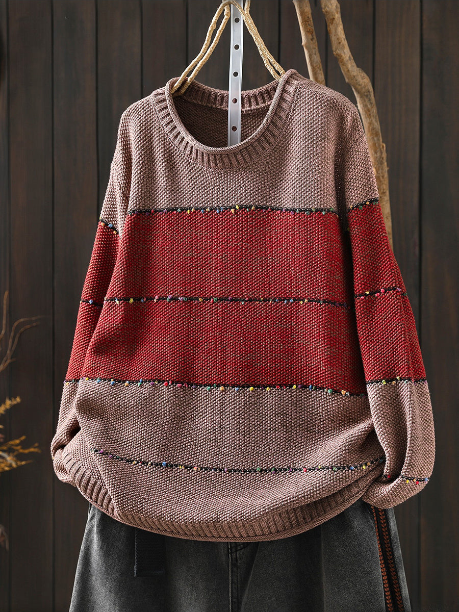 Suéter feminino retrô de gola redonda com blocos de cores para a primavera