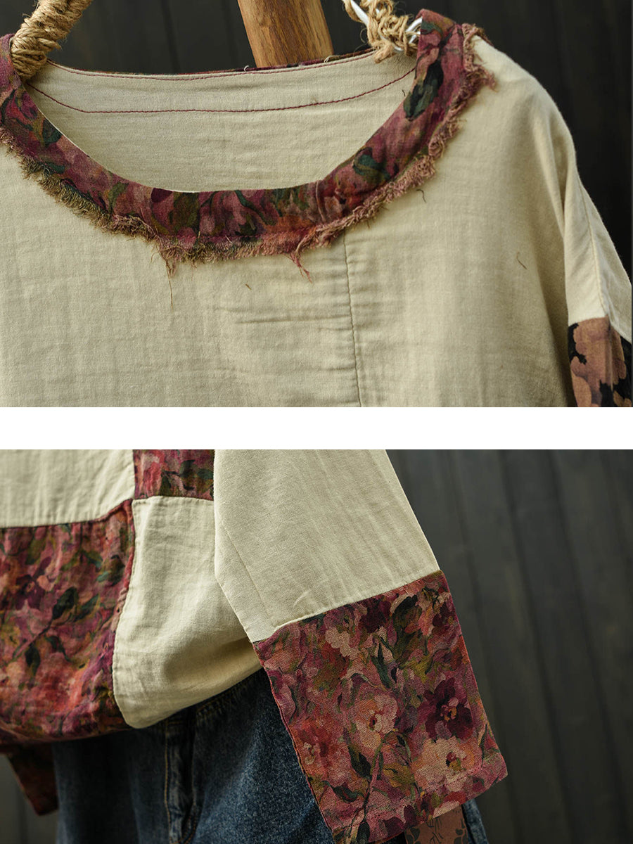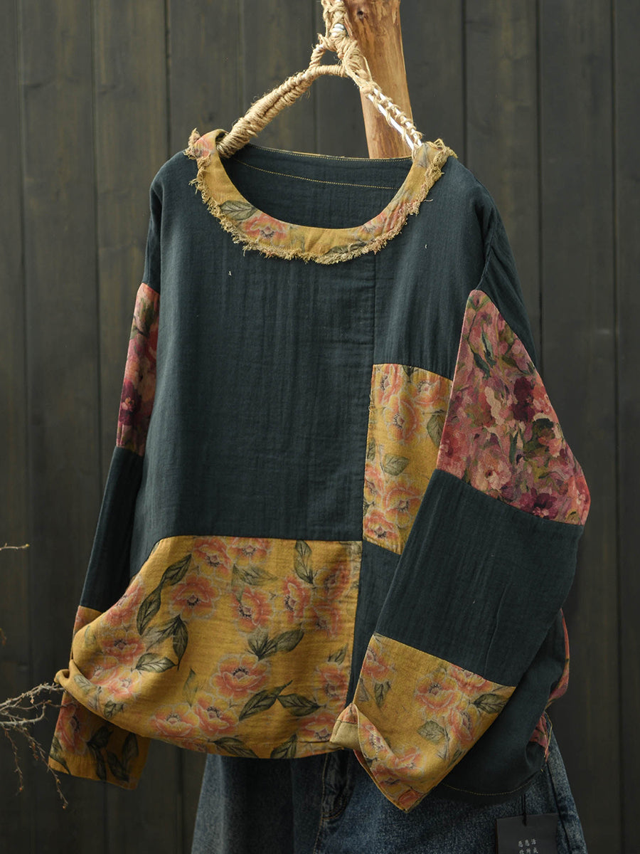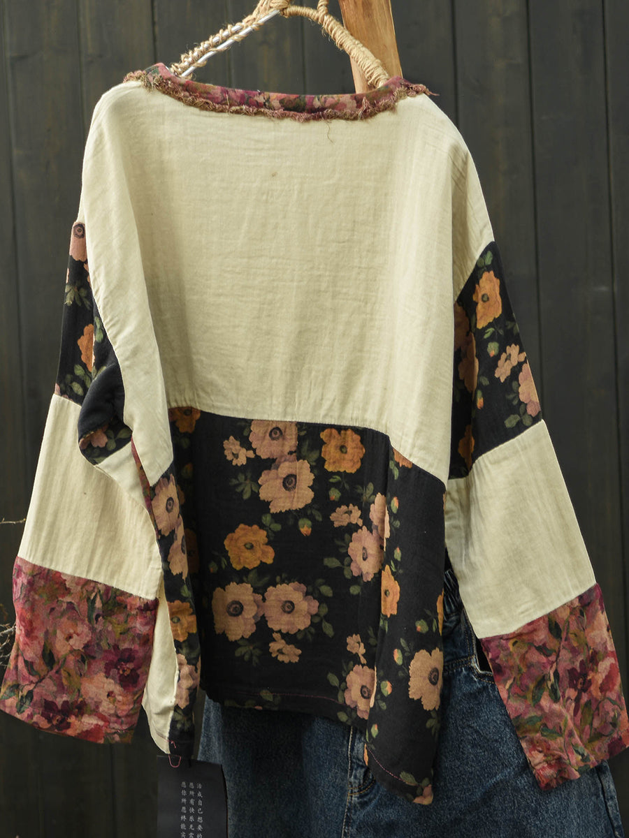 Camisa feminina de algodão com estampa floral retrô para a primavera