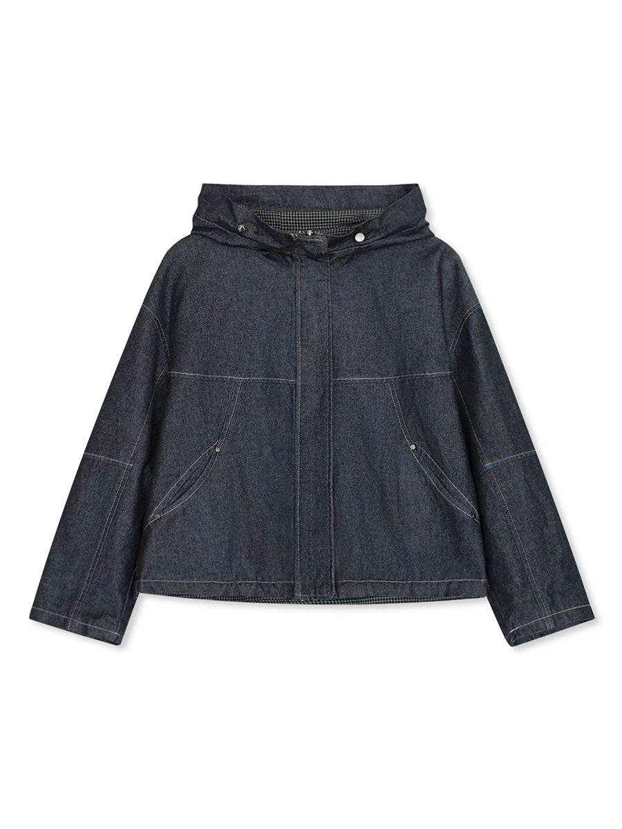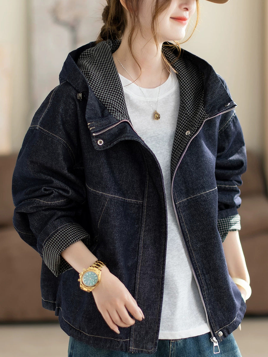 Casaco feminino de primavera retrô em jeans com capuz e cor lisa