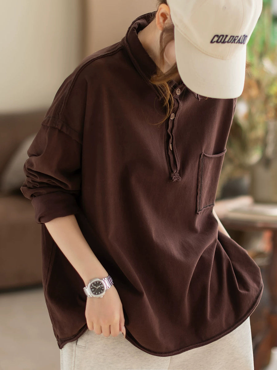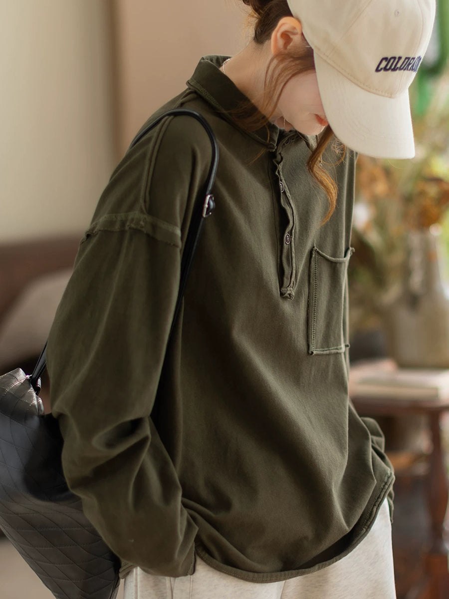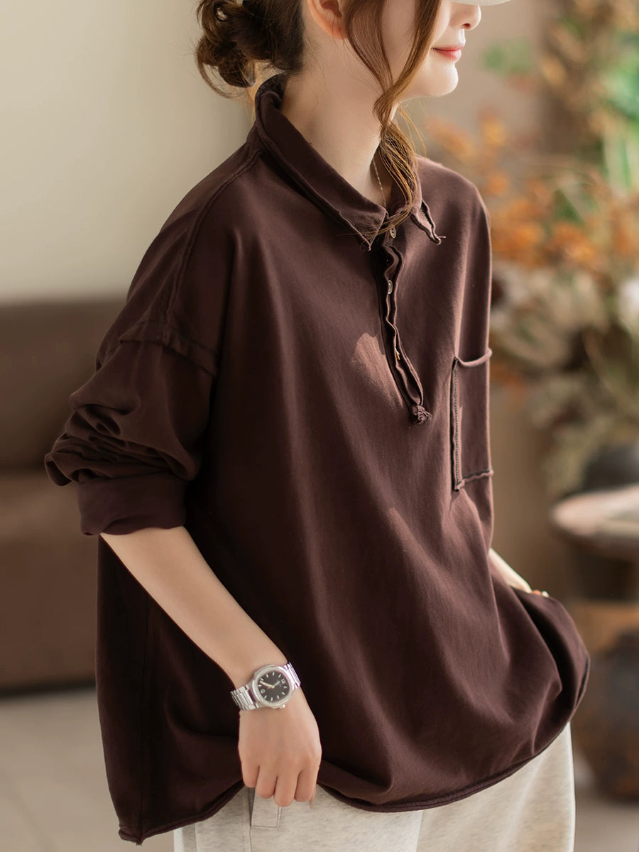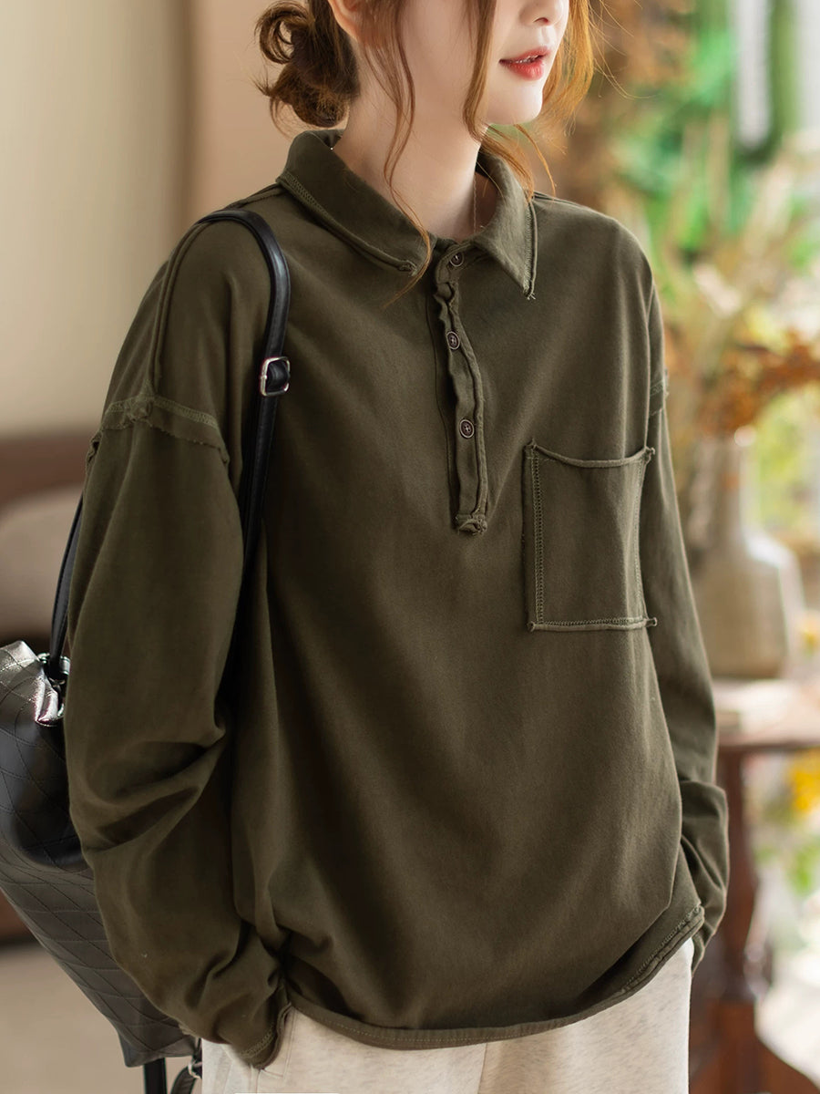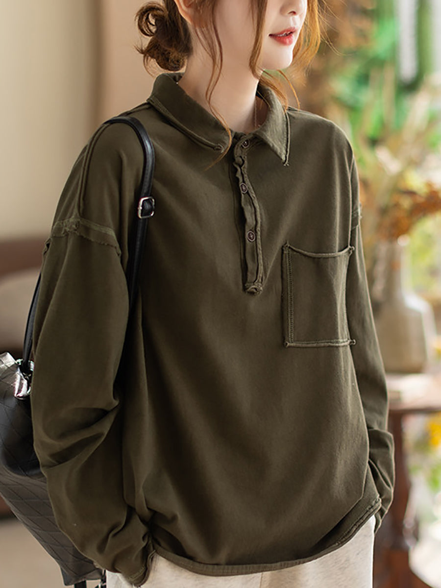 Blusa feminina de primavera retrô em cor lisa com gola dobrável