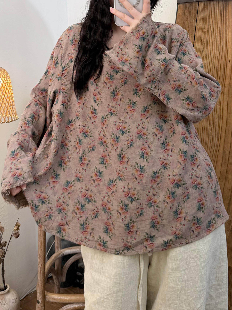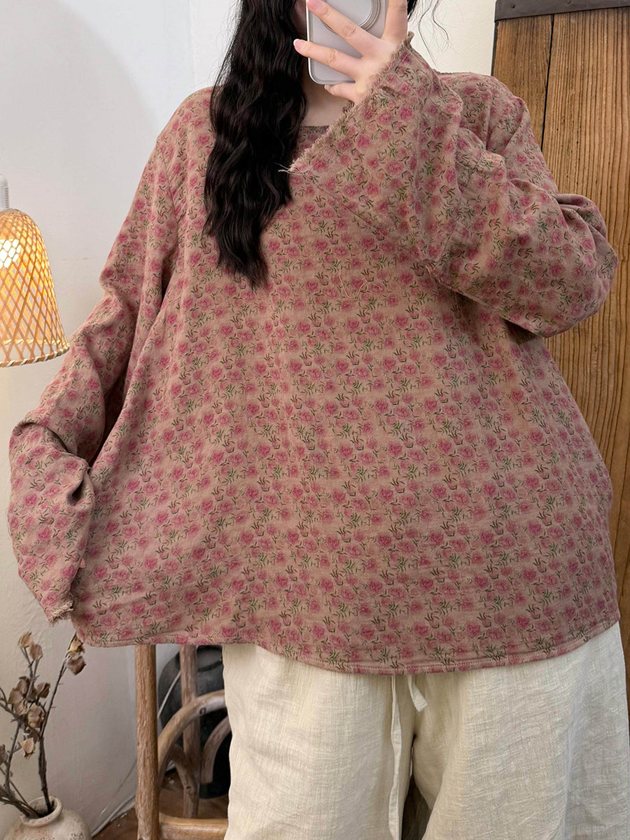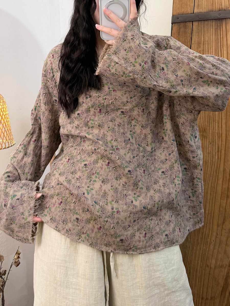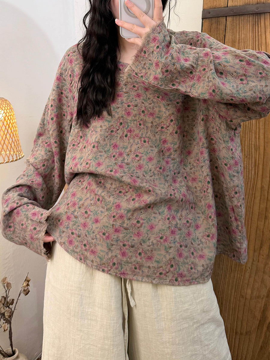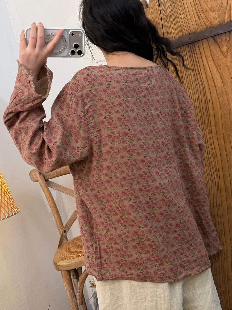 Blusa feminina de algodão com estampa floral vintage e gola redonda, estilo primavera.