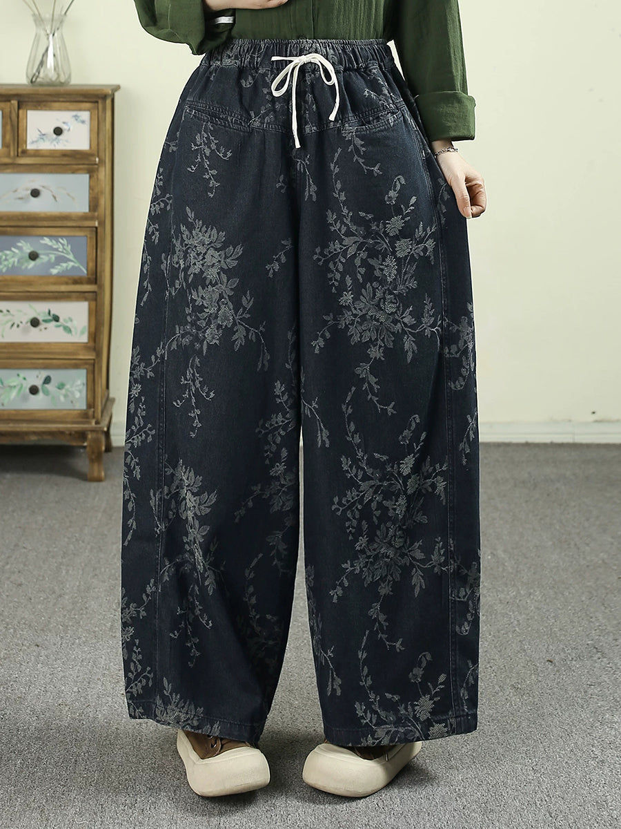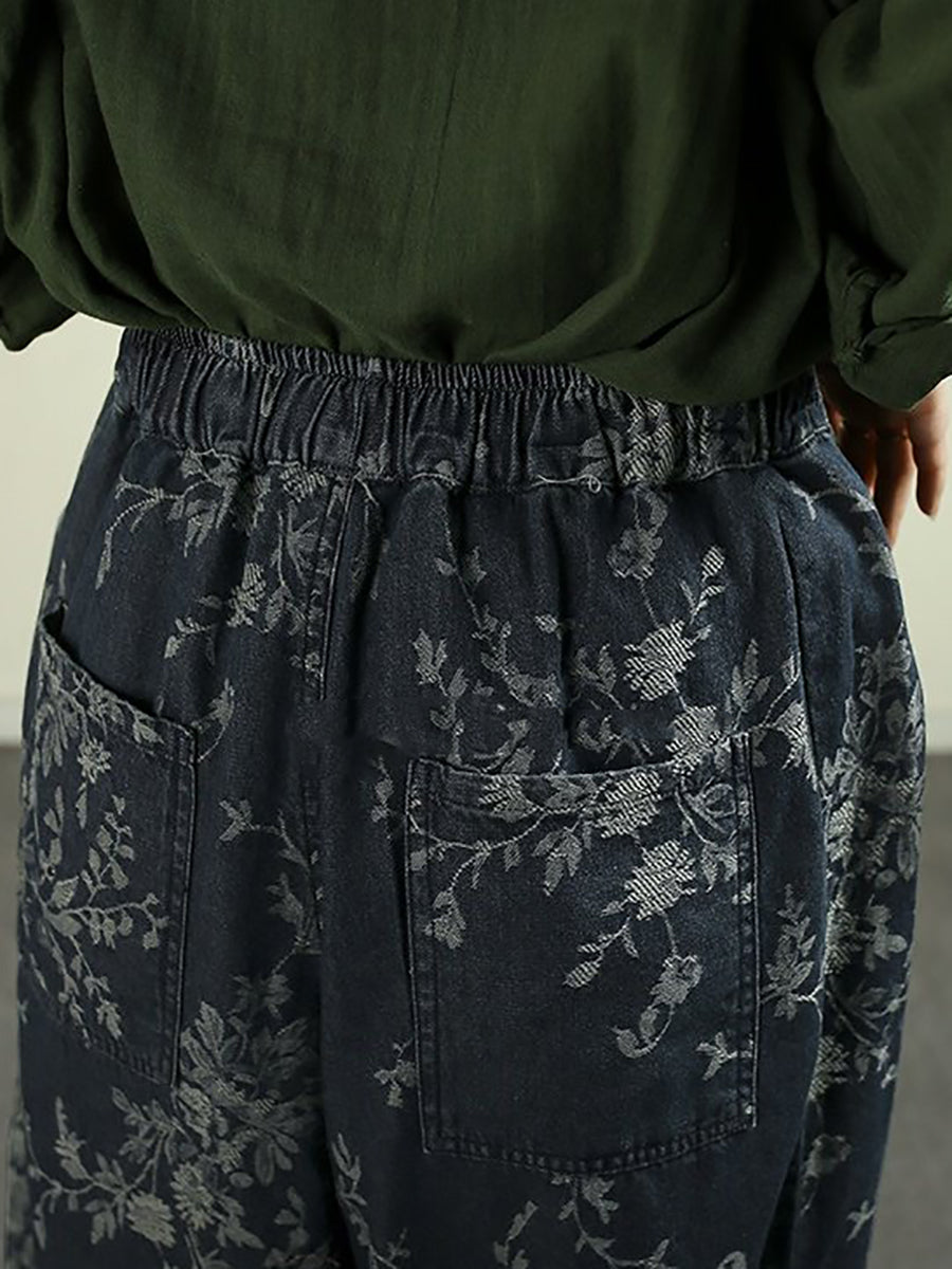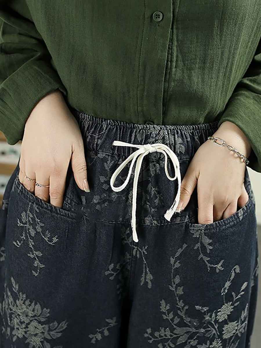 Calça feminina de algodão com estampa floral vintage para a primavera