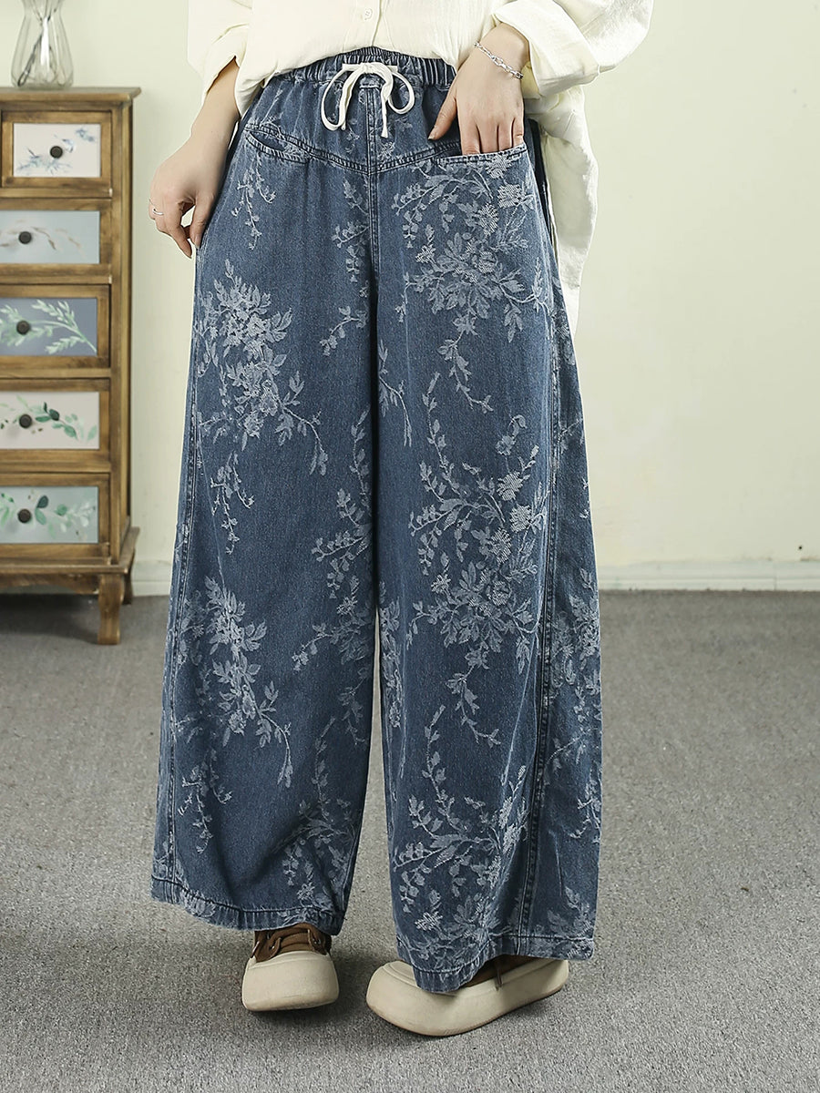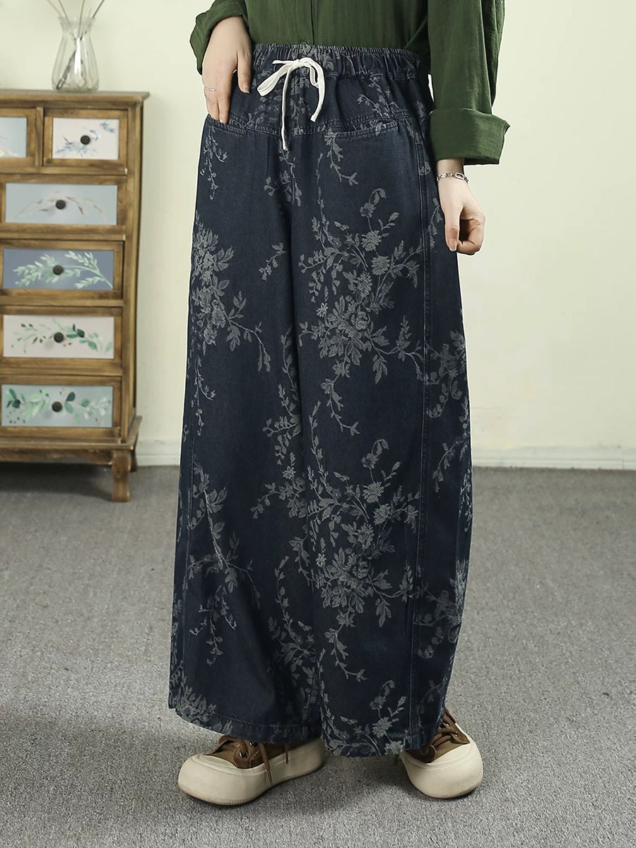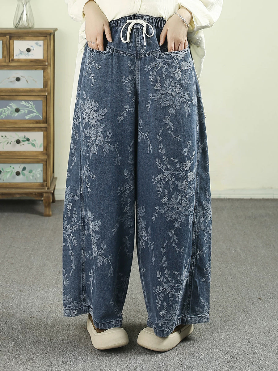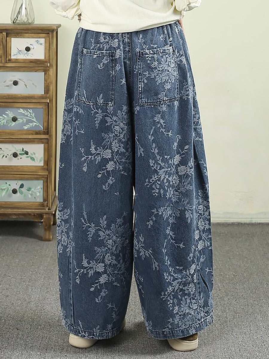 Calça feminina de algodão com estampa floral vintage para a primavera