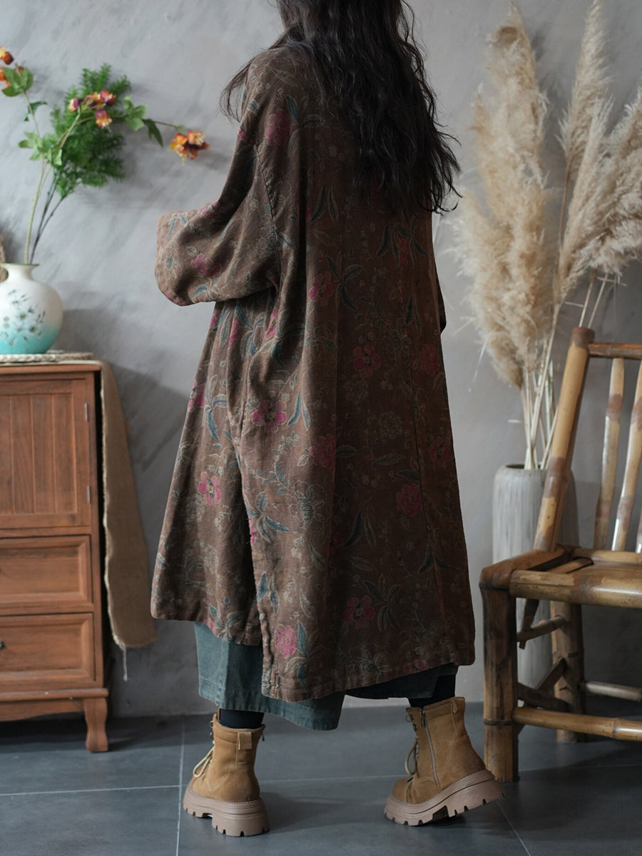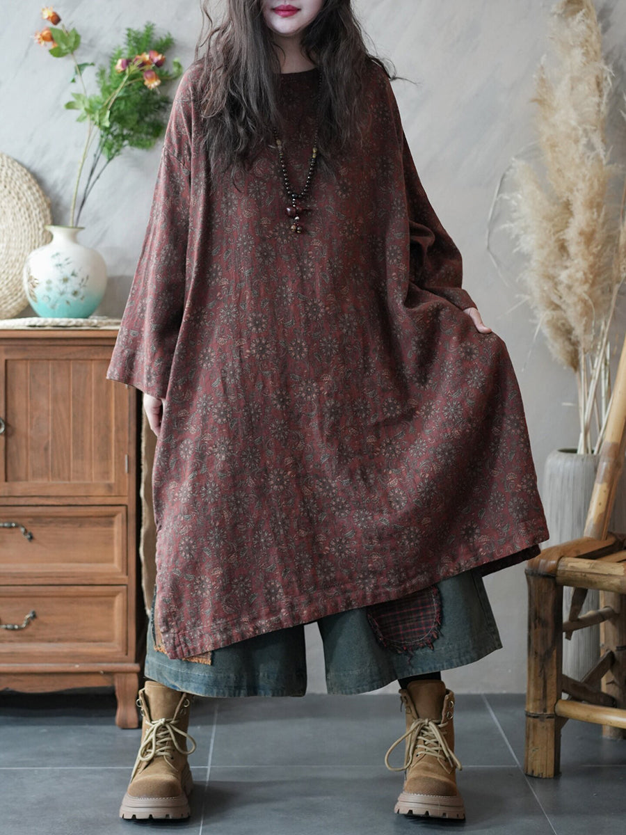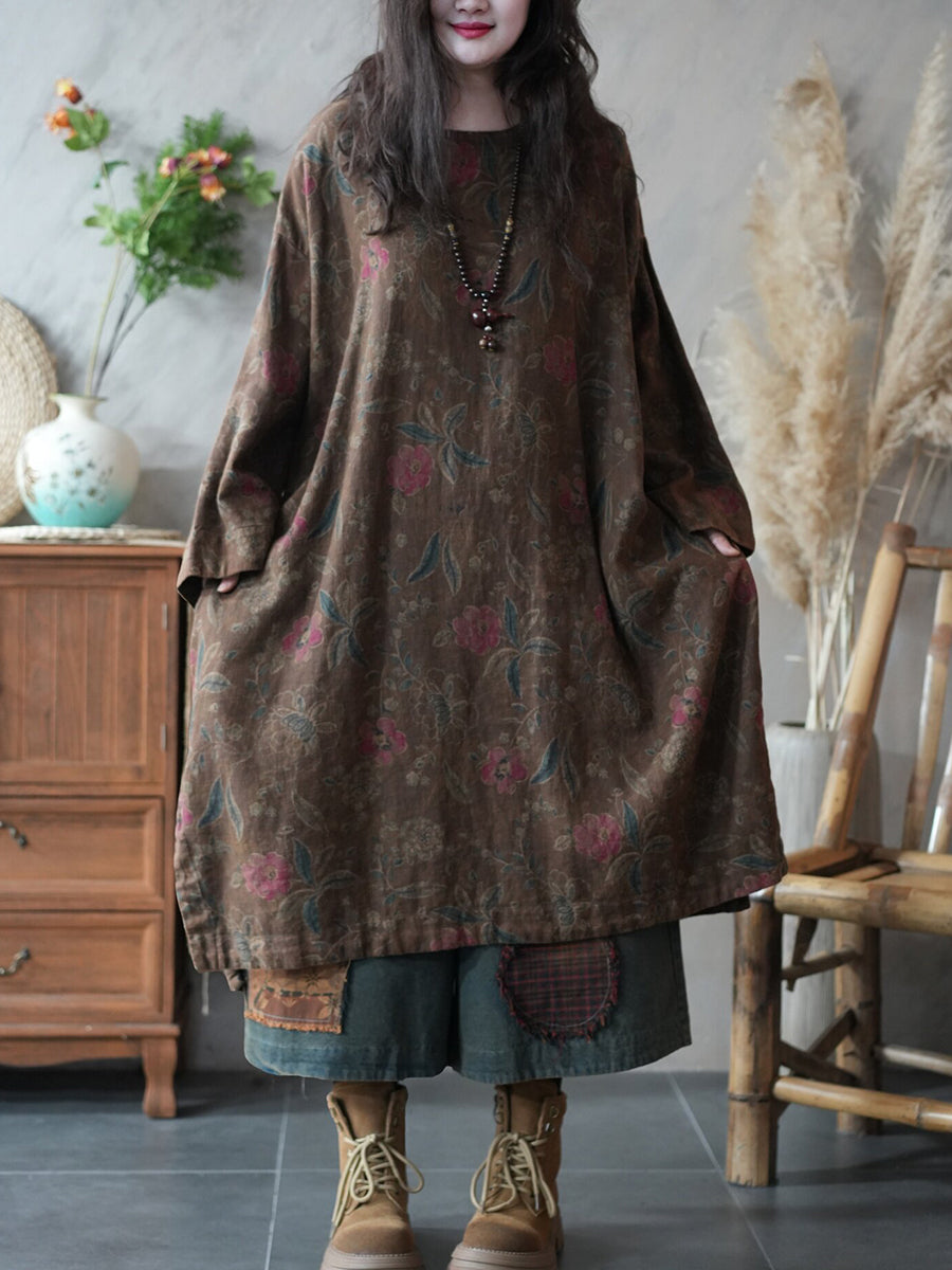 Vestido feminino vintage de primavera com estampa floral e decote redondo