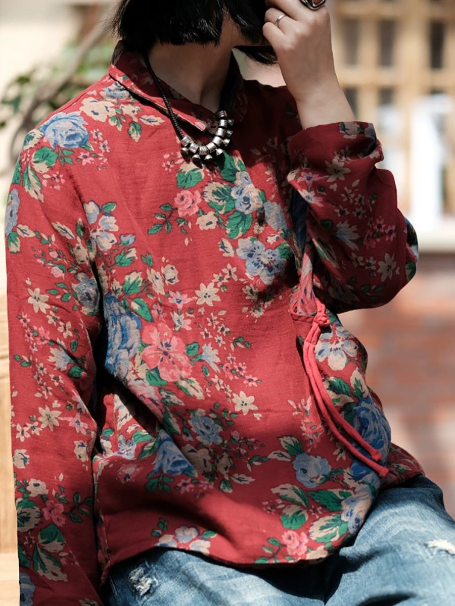 Camisa feminina de algodão 100% com estampa floral vintage para a primavera