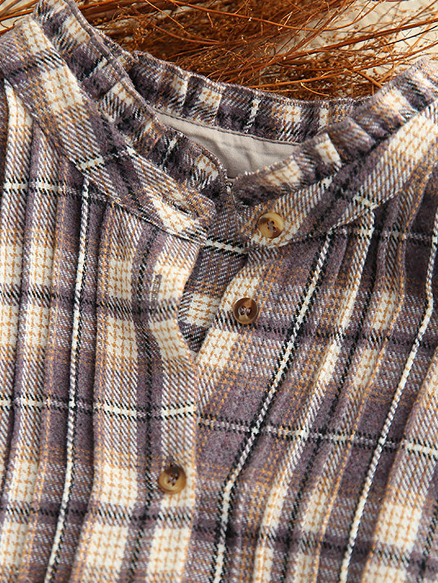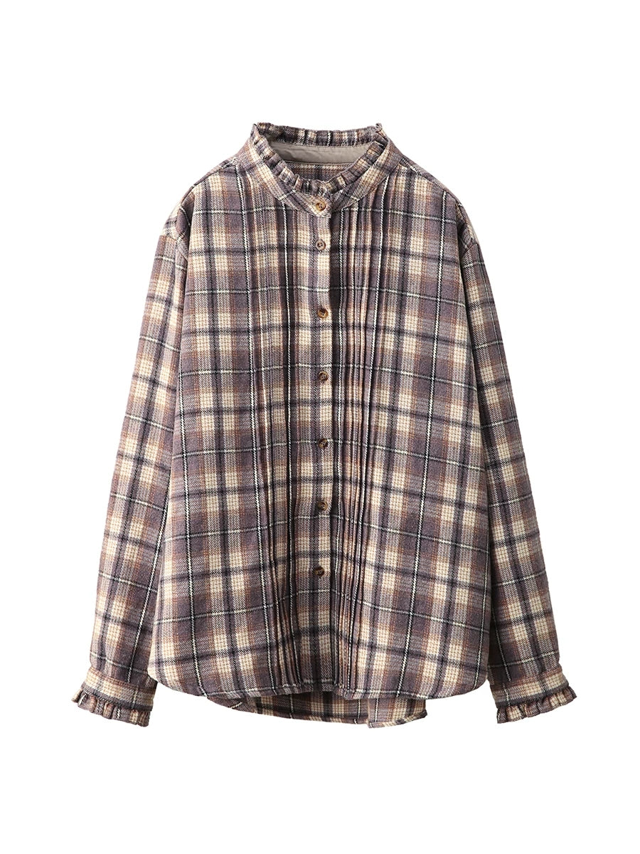 Camisa feminina vintage xadrez de primavera com gola dobrável