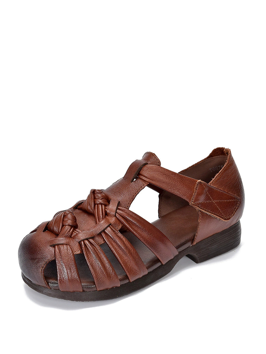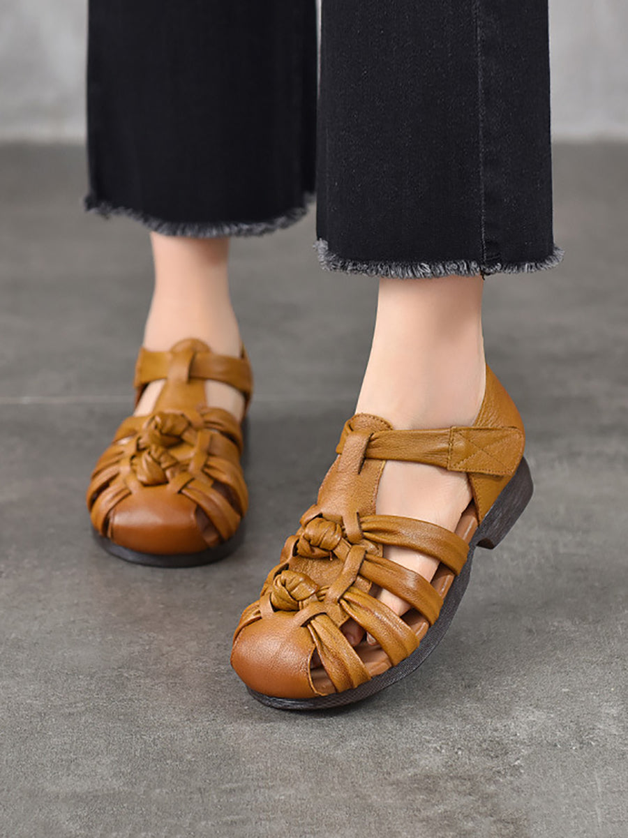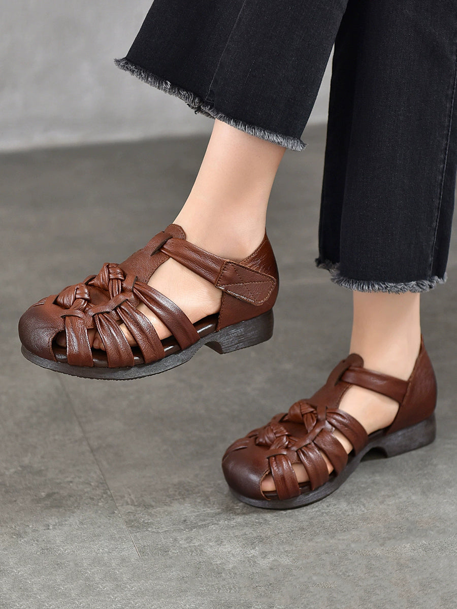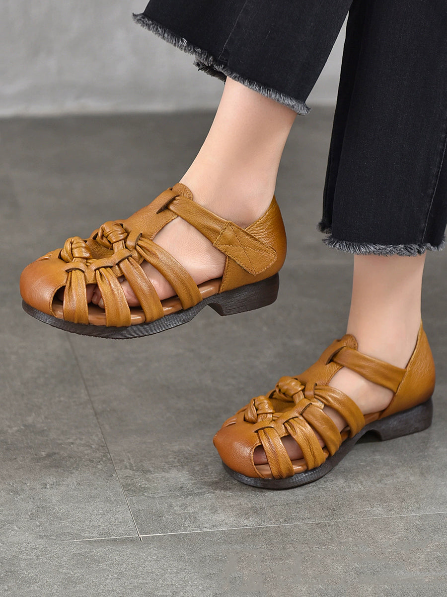 Sandálias femininas de verão em couro genuíno trançado com salto baixo.