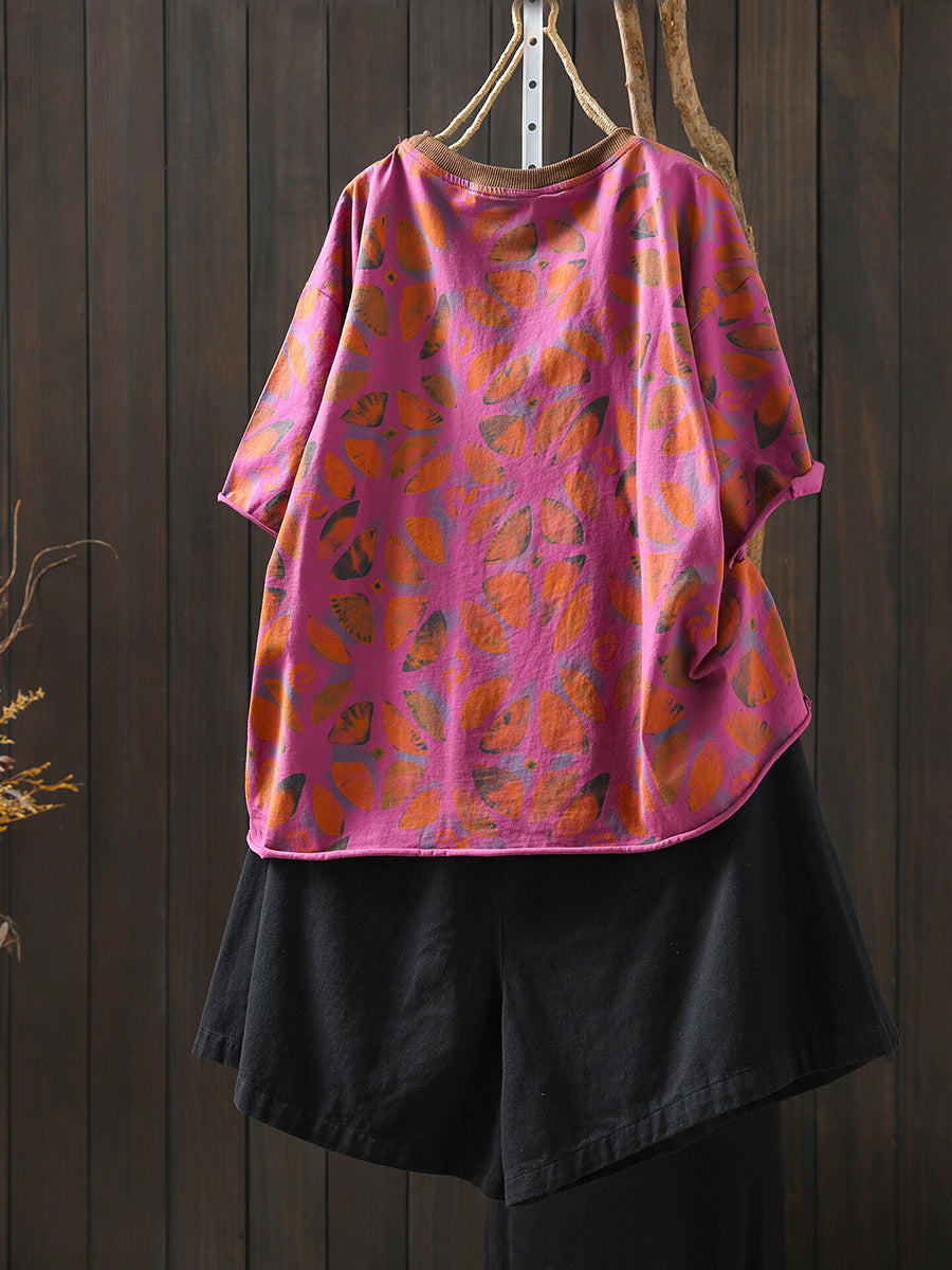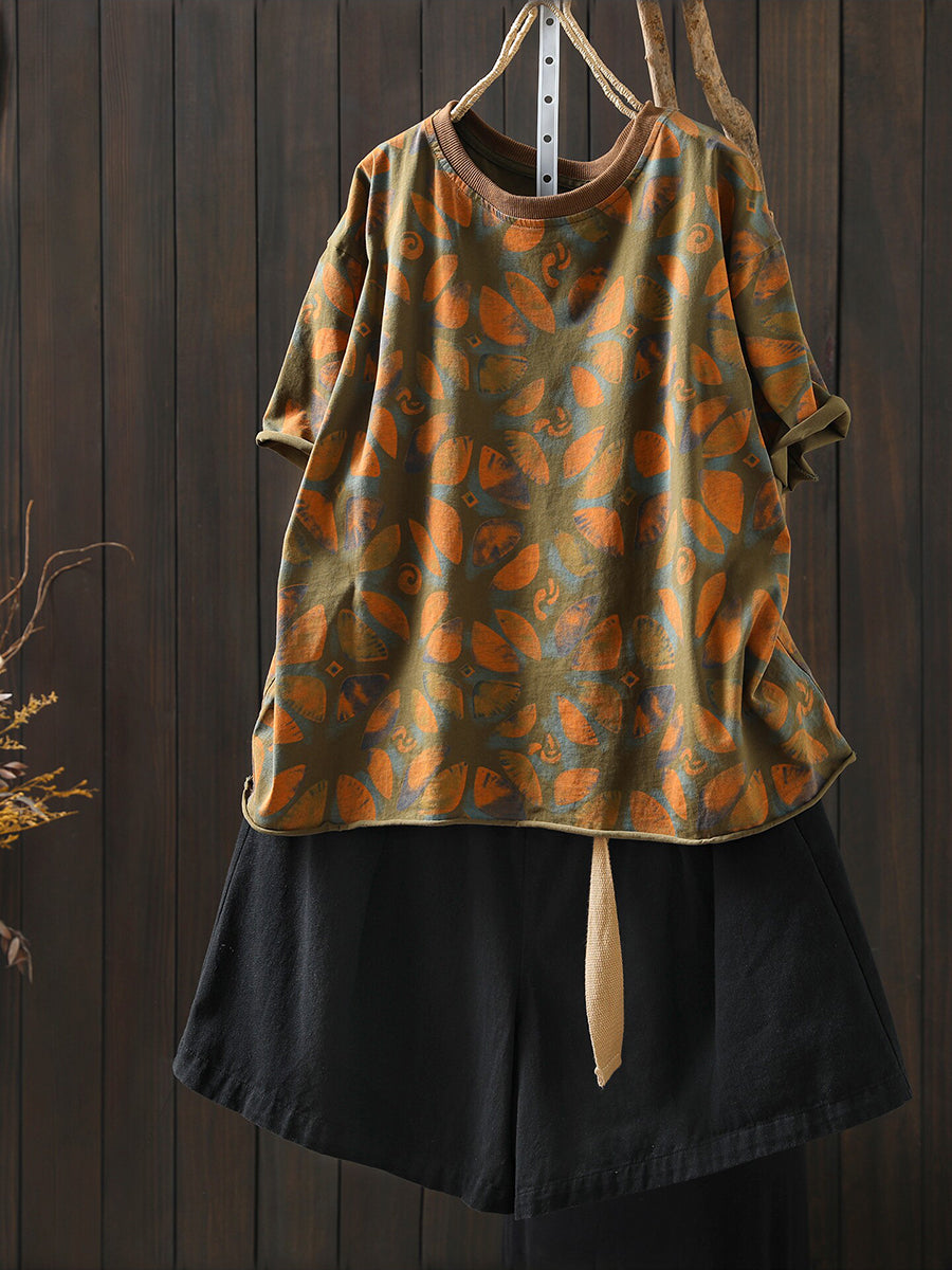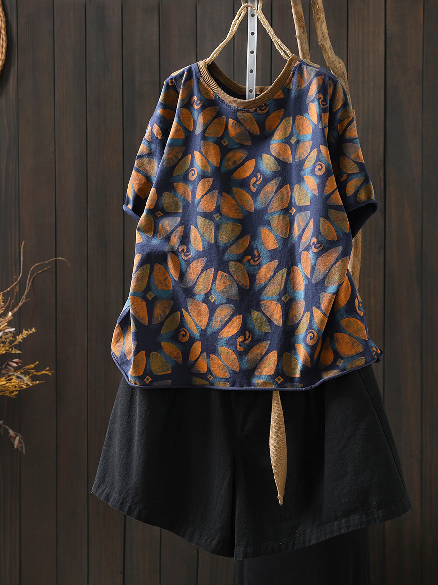 Camisa feminina de algodão com estampa floral artística para o verão