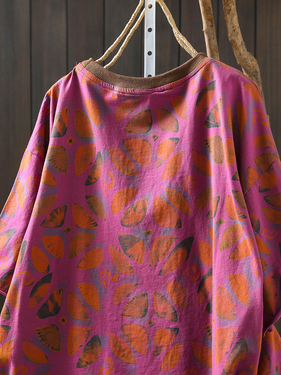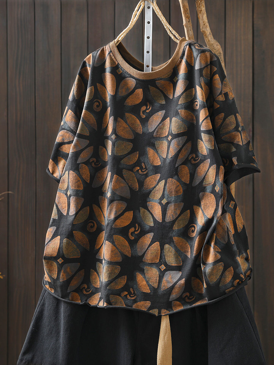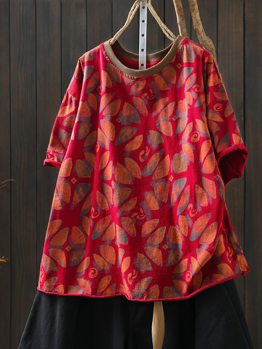 Camisa feminina de algodão com estampa floral artística para o verão