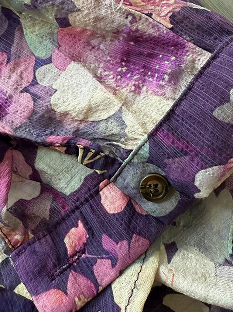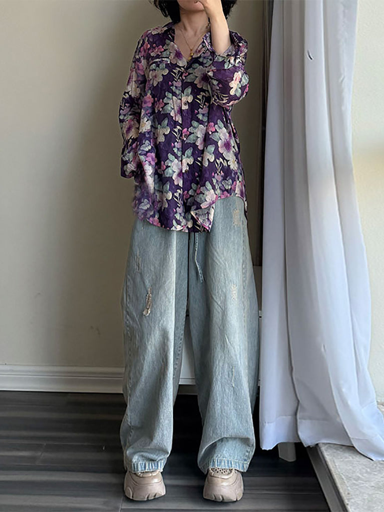 Camisa feminina de verão com decote em V e manga comprida com estampa floral artística