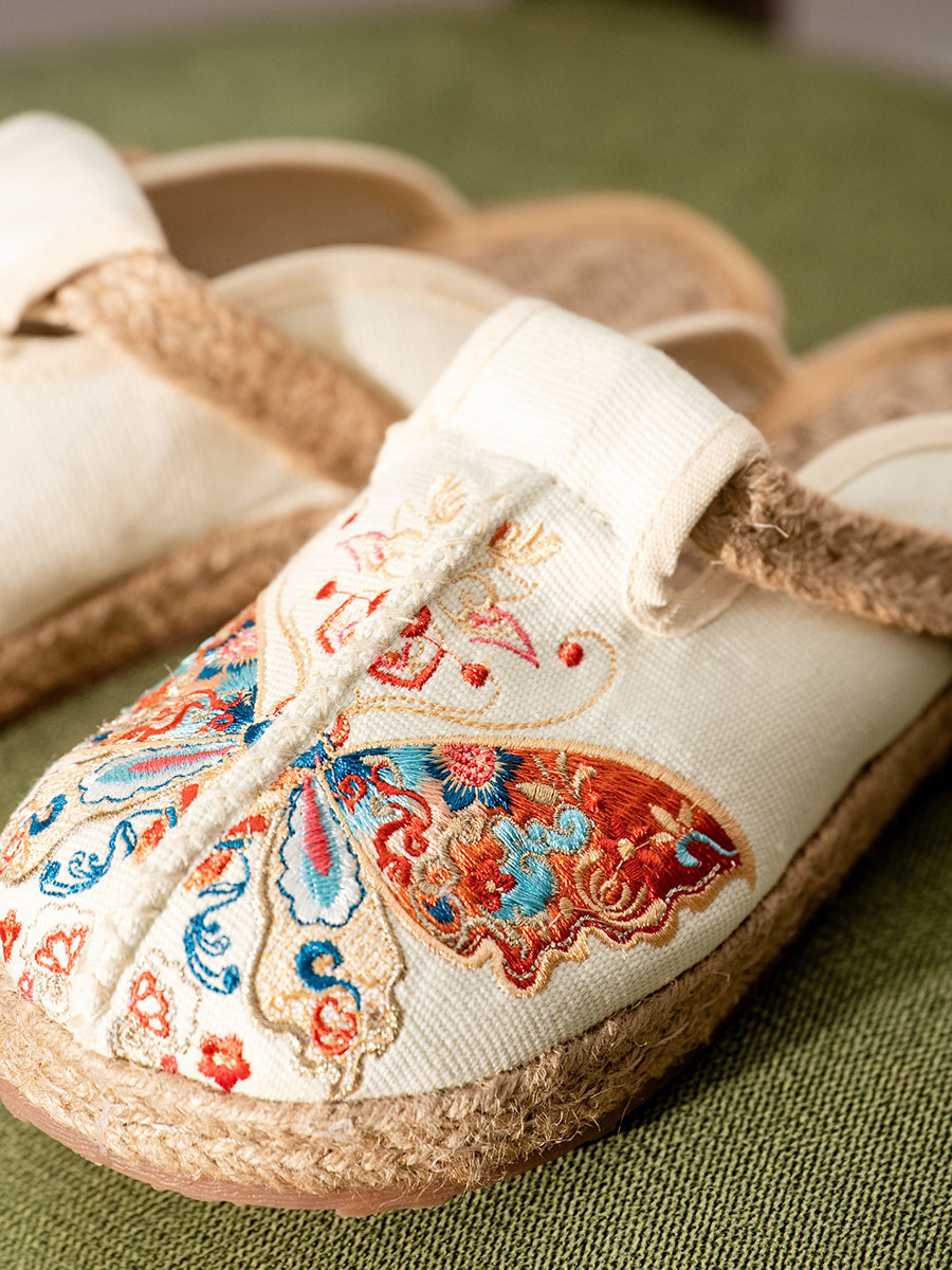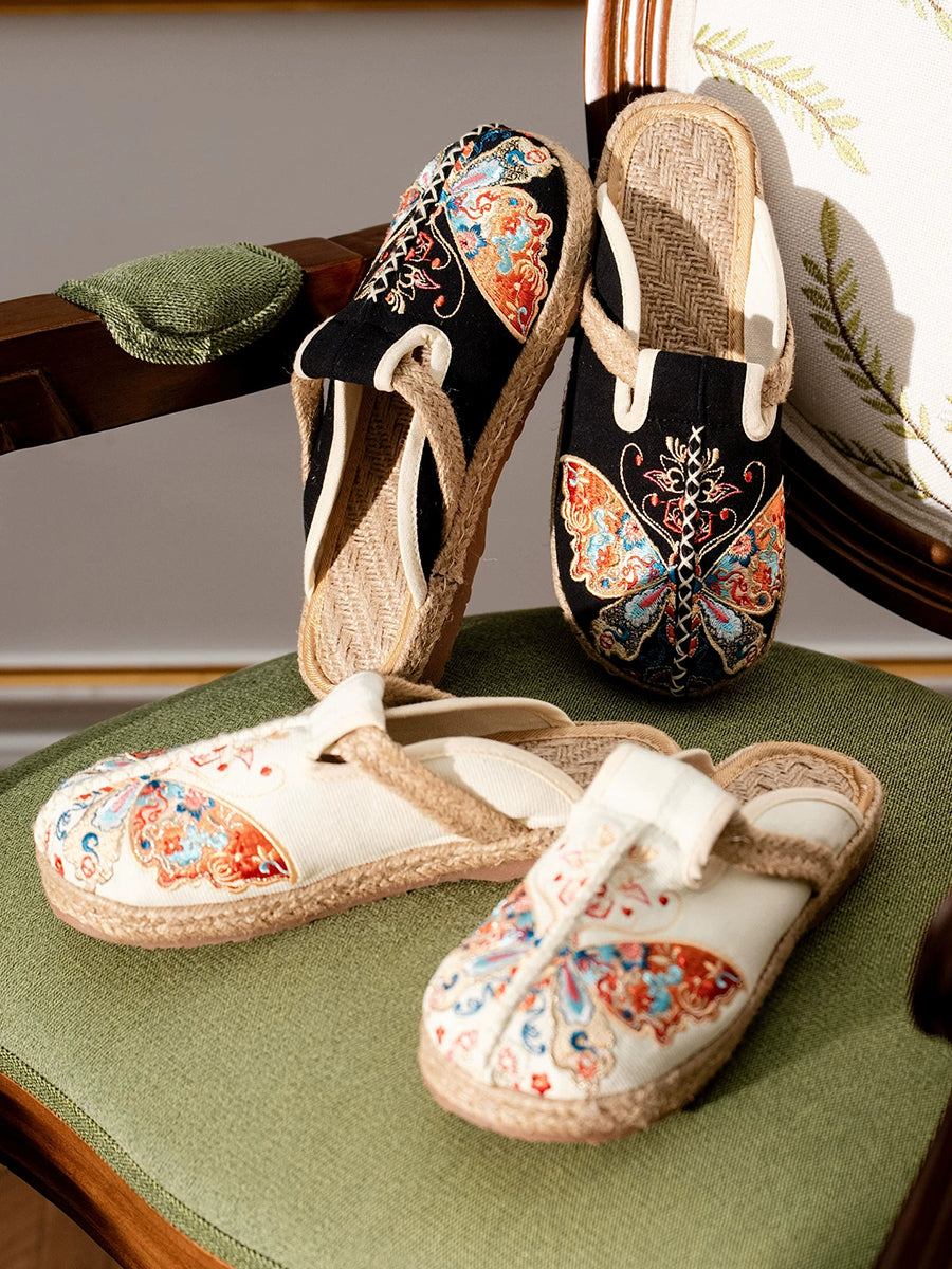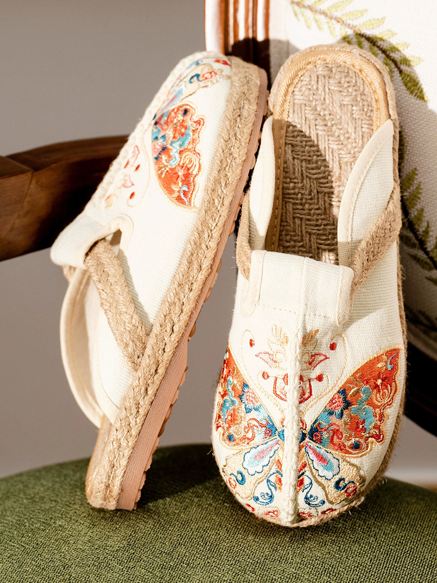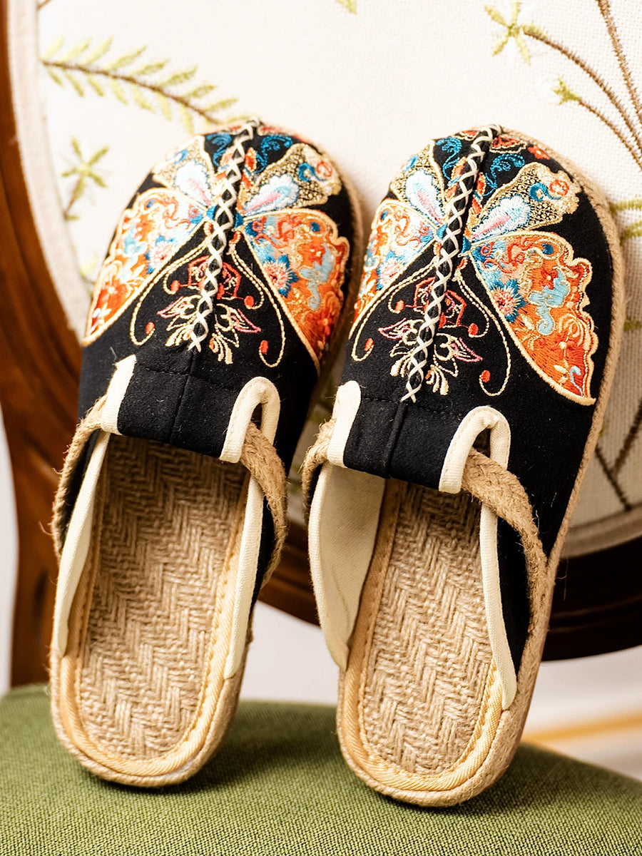 Chinelo feminino de verão em lona com bordado de borboletas