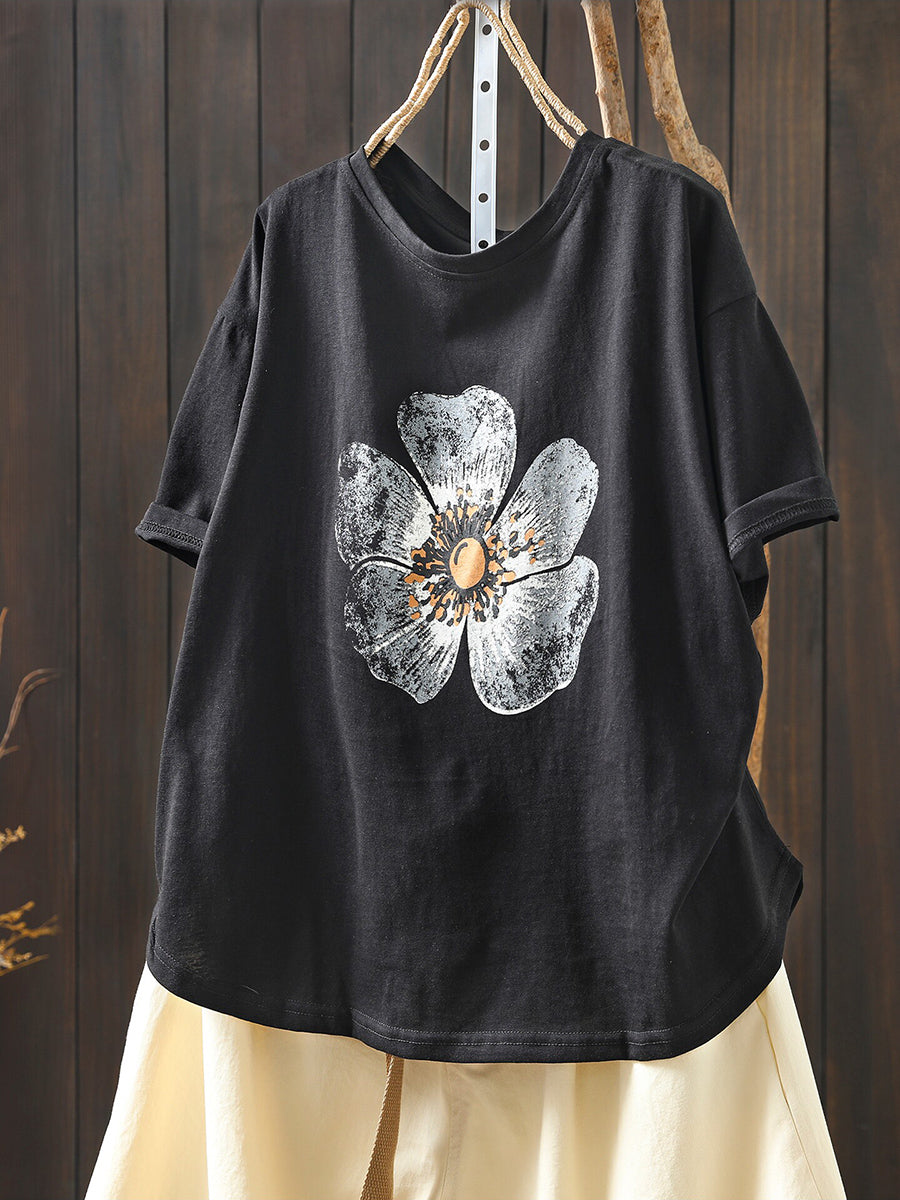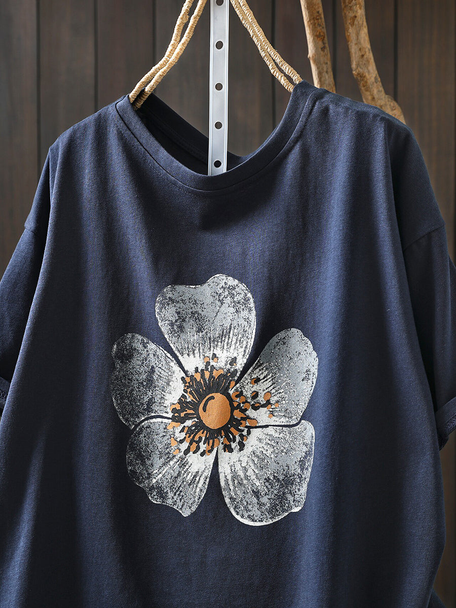 Camisa feminina casual de verão com estampa floral e gola redonda