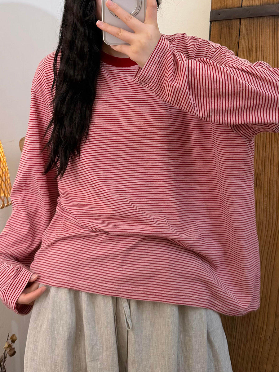 Blusa feminina de algodão listrada com decote redondo para o verão.