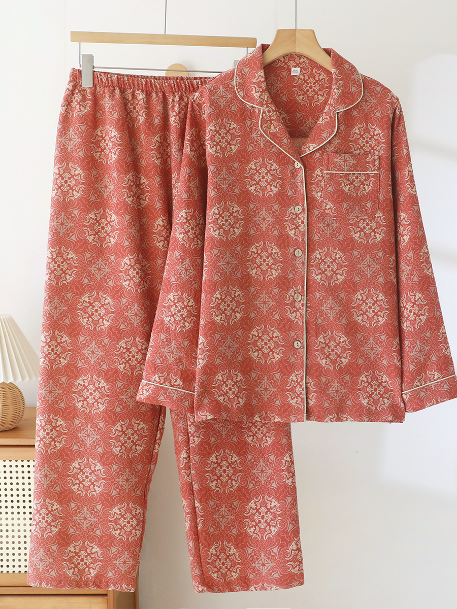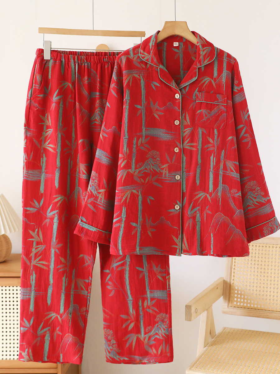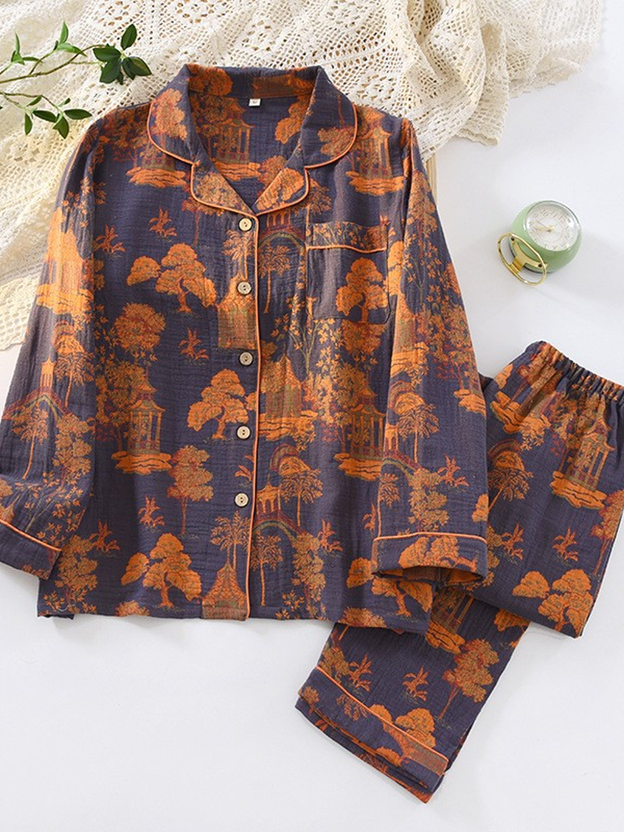 Conjunto de pijama feminino de verão com estampa de pinheiros em jacquard de gaze.