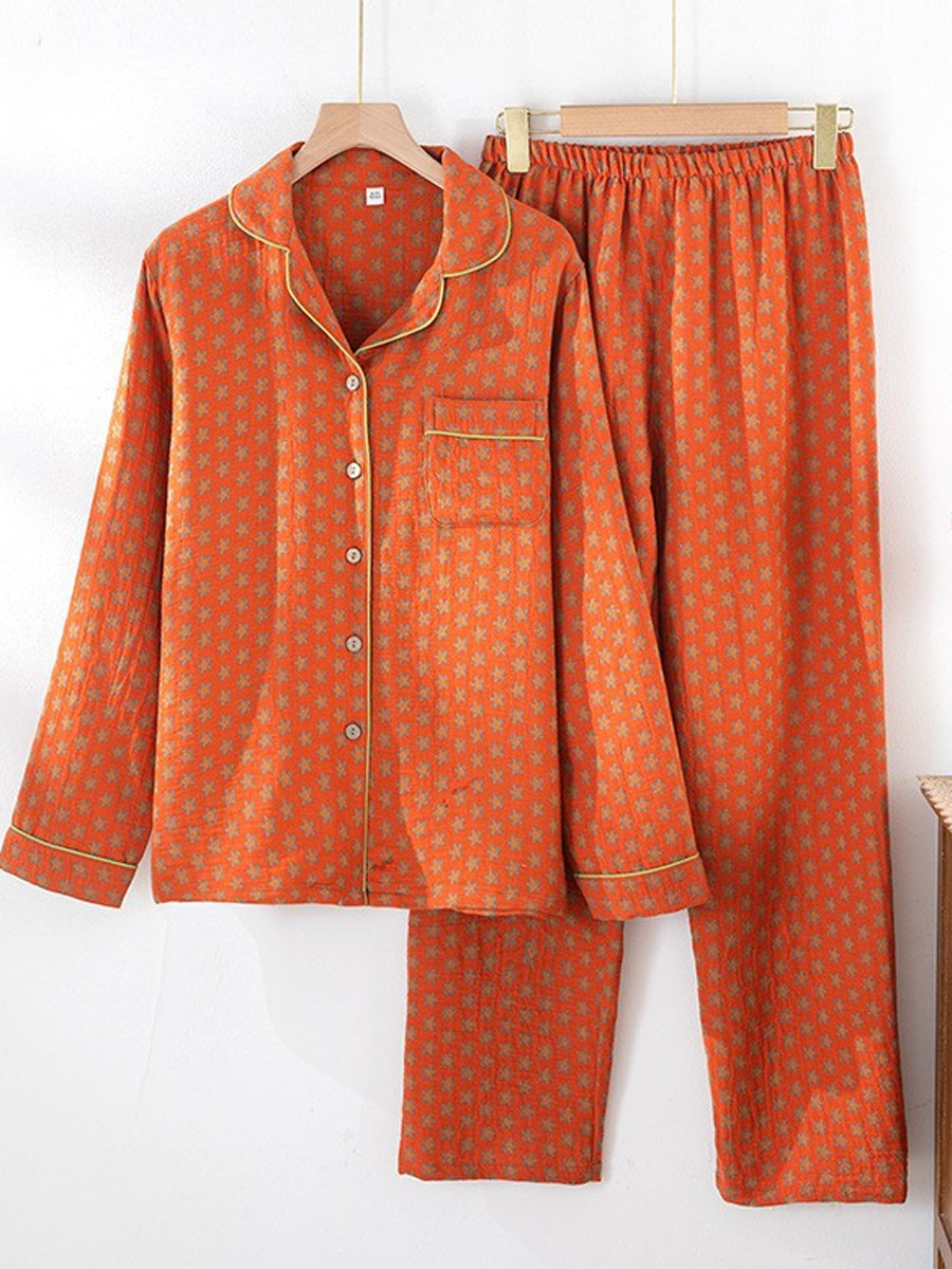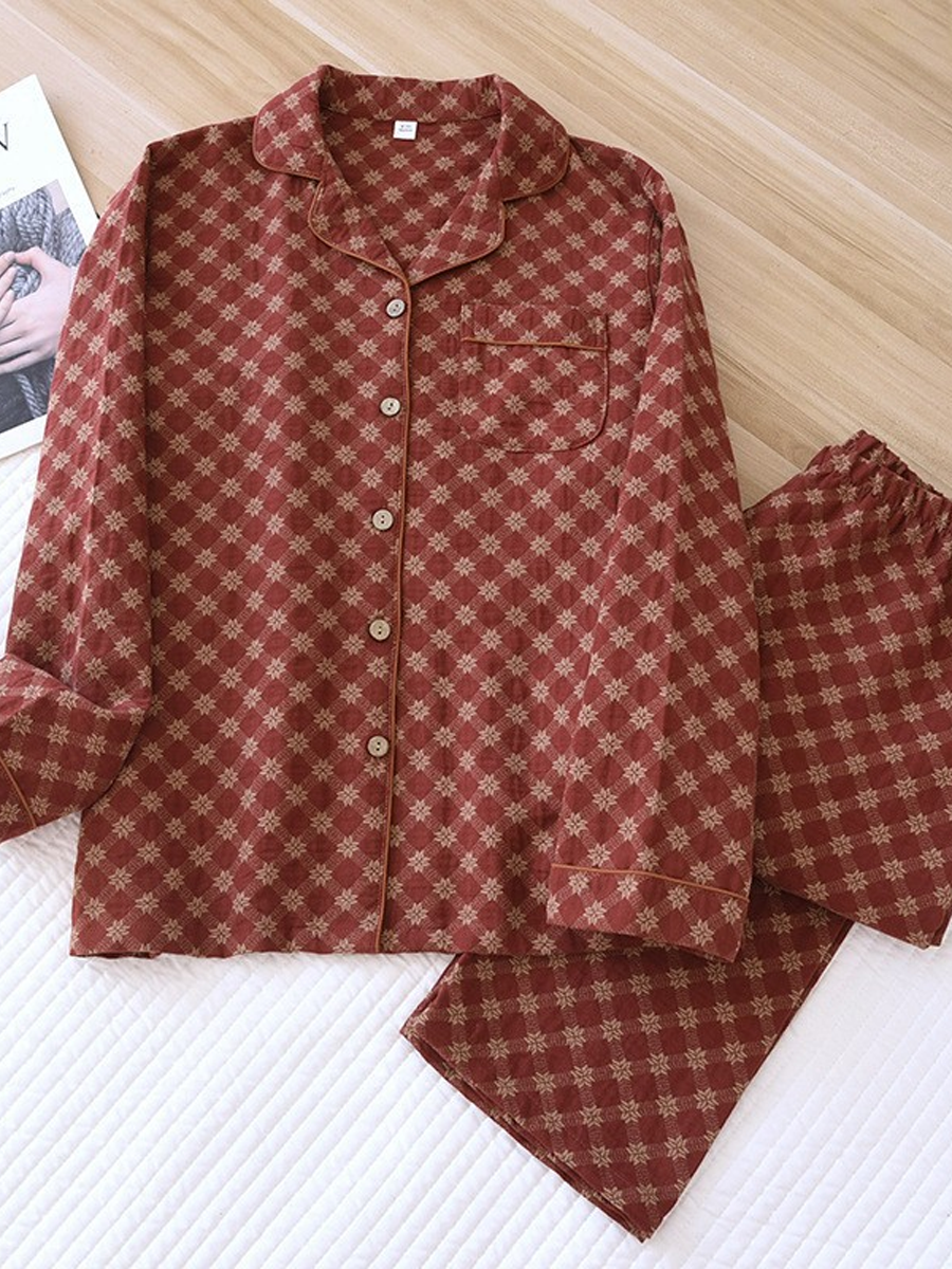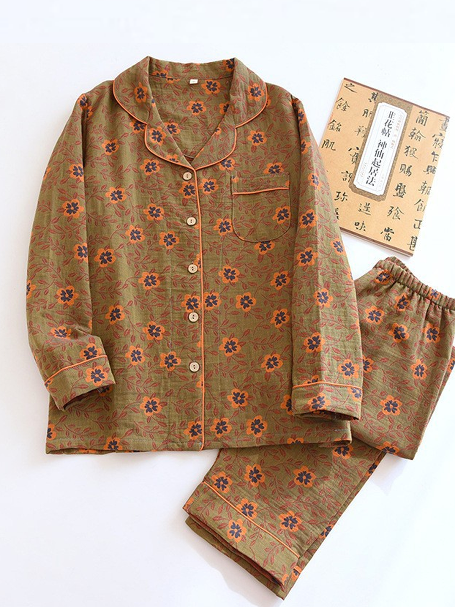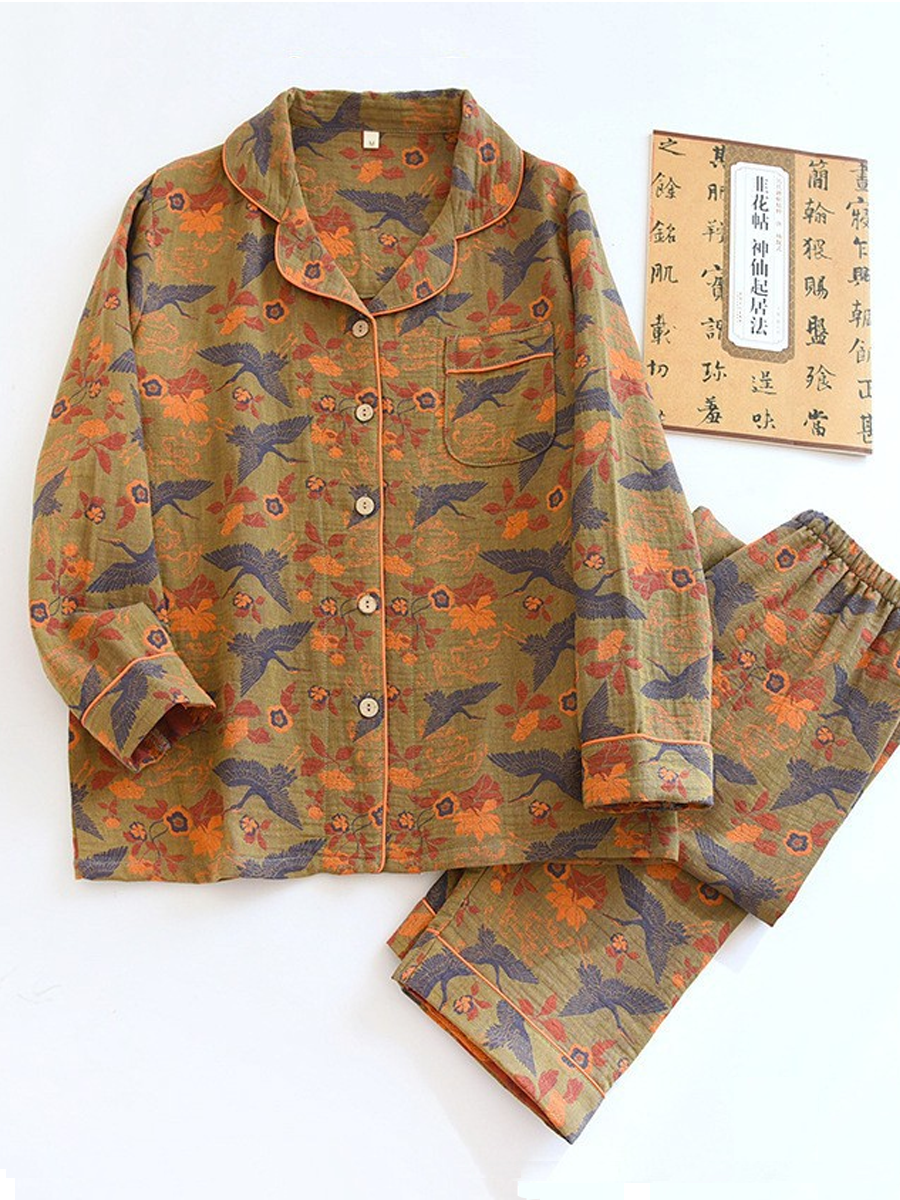 Conjunto de pijama feminino de verão com estampa de pinheiros em jacquard de gaze.