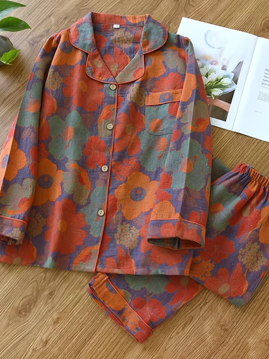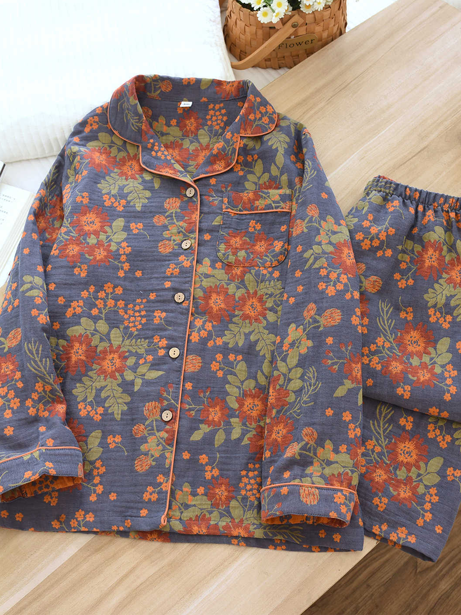 O Conjunto de pijama feminino de verão com estampa floral Confeccionado em gaze jacquard macia para maior conforto, este conjunto elegante apresenta decote em V, estampa floral, mangas compridas e cintura elástica, com calças compridas perfeitas para relaxar em casa.