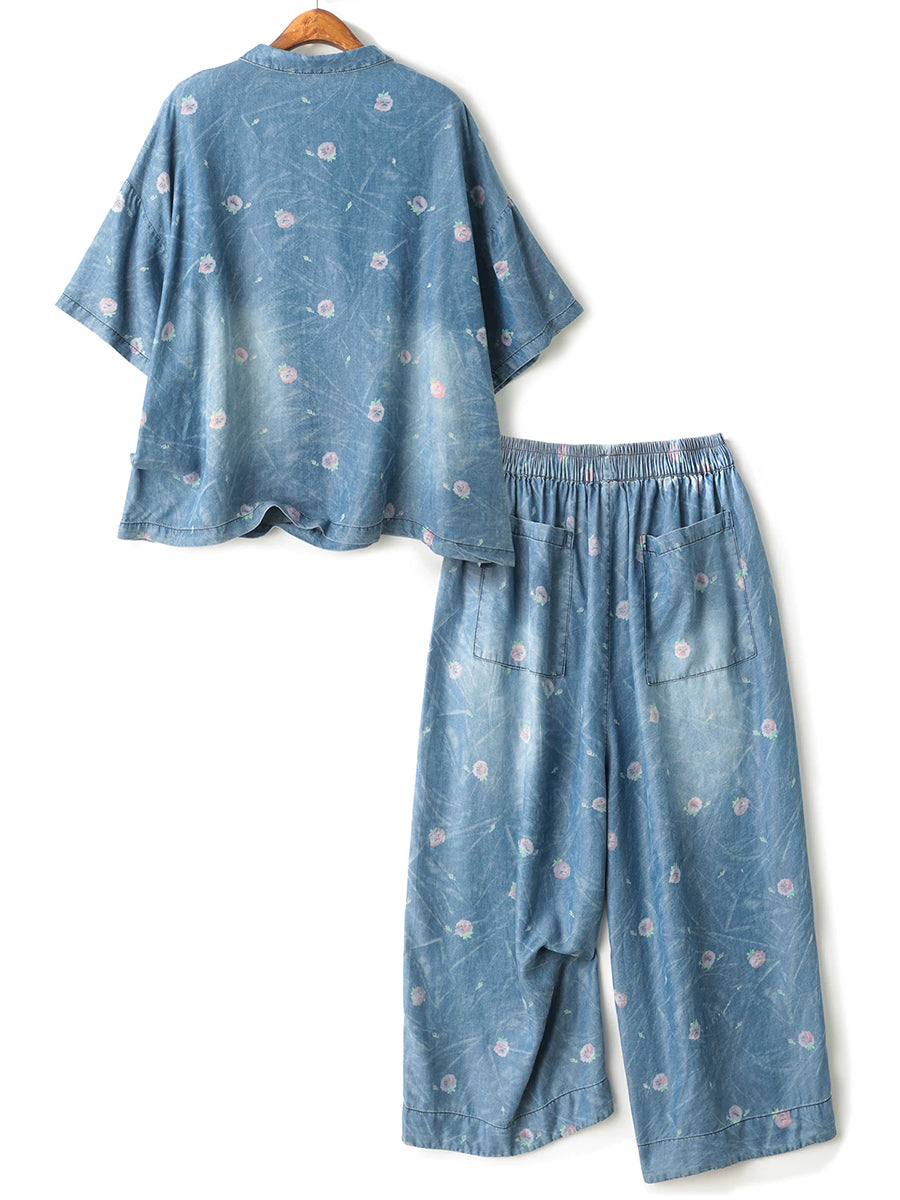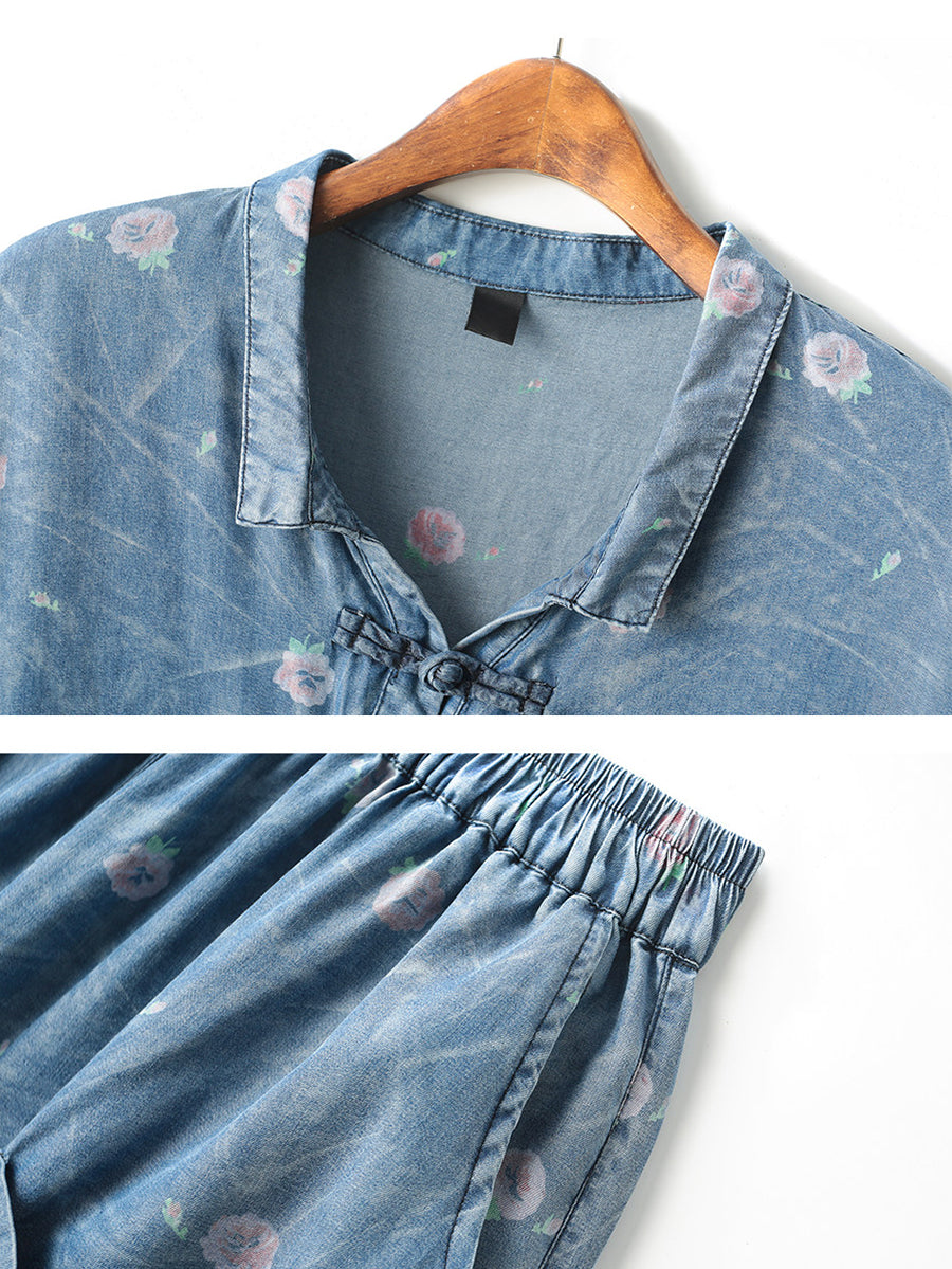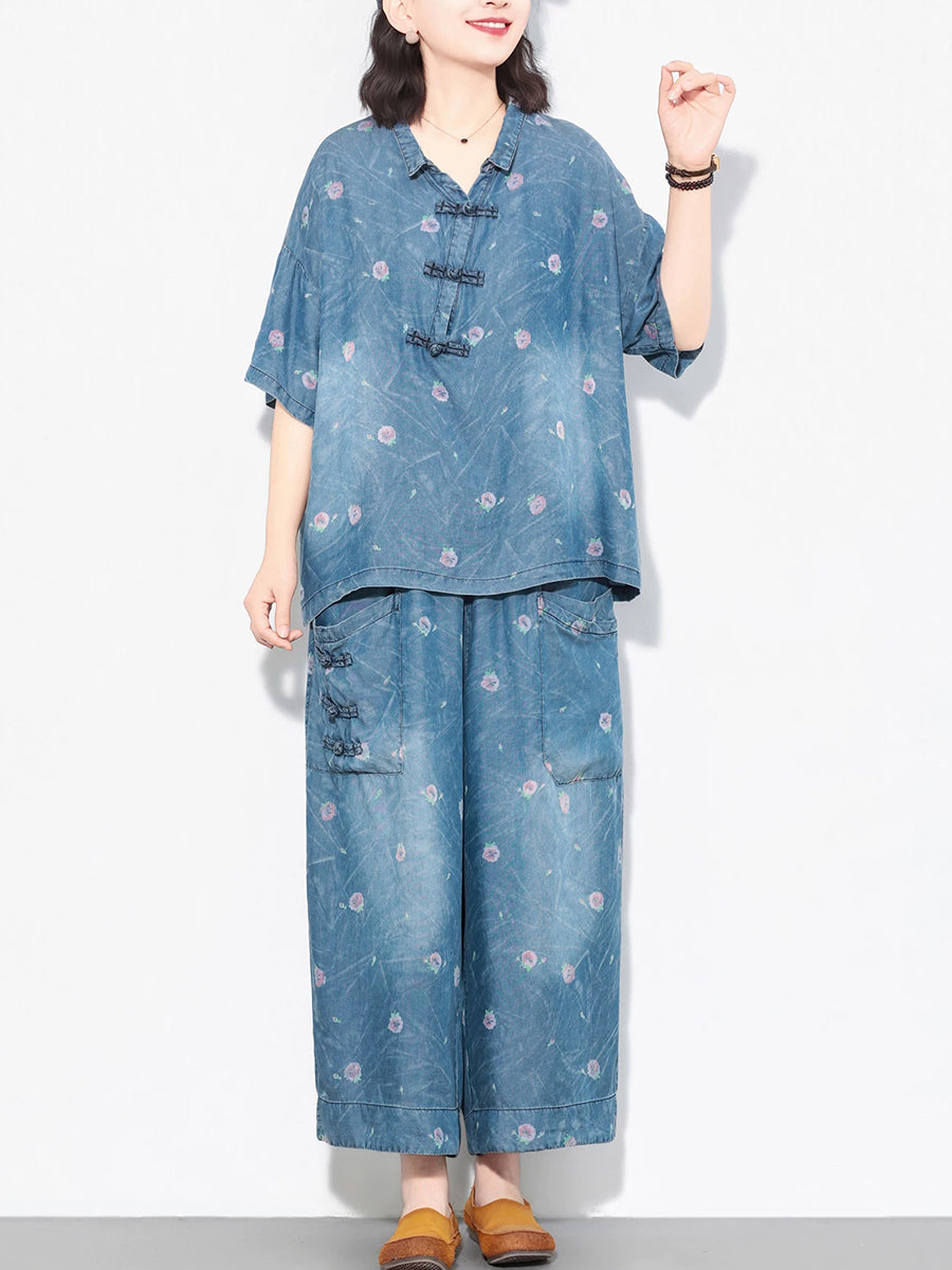 Conjunto feminino de verão em jeans com estampa floral étnica