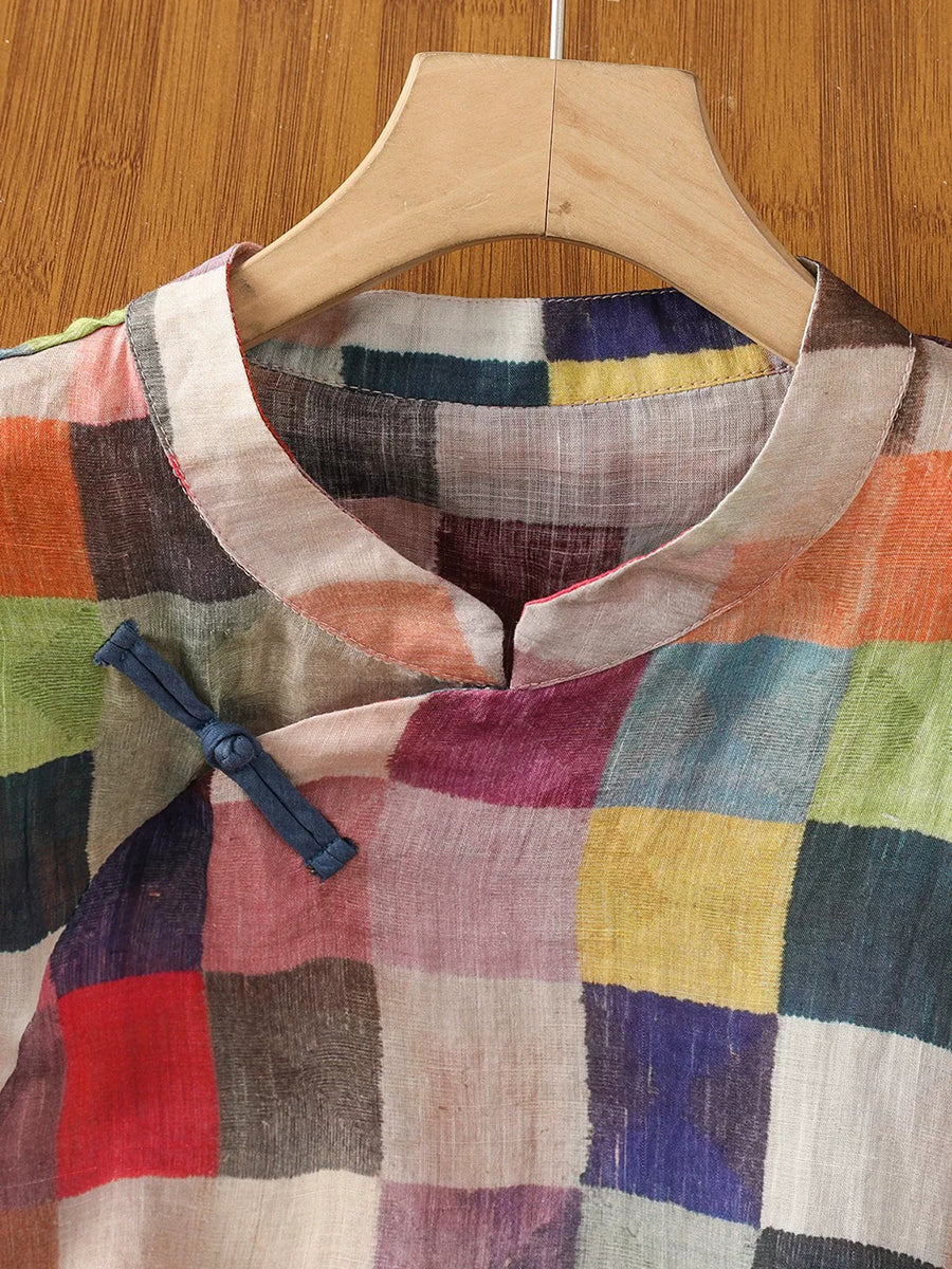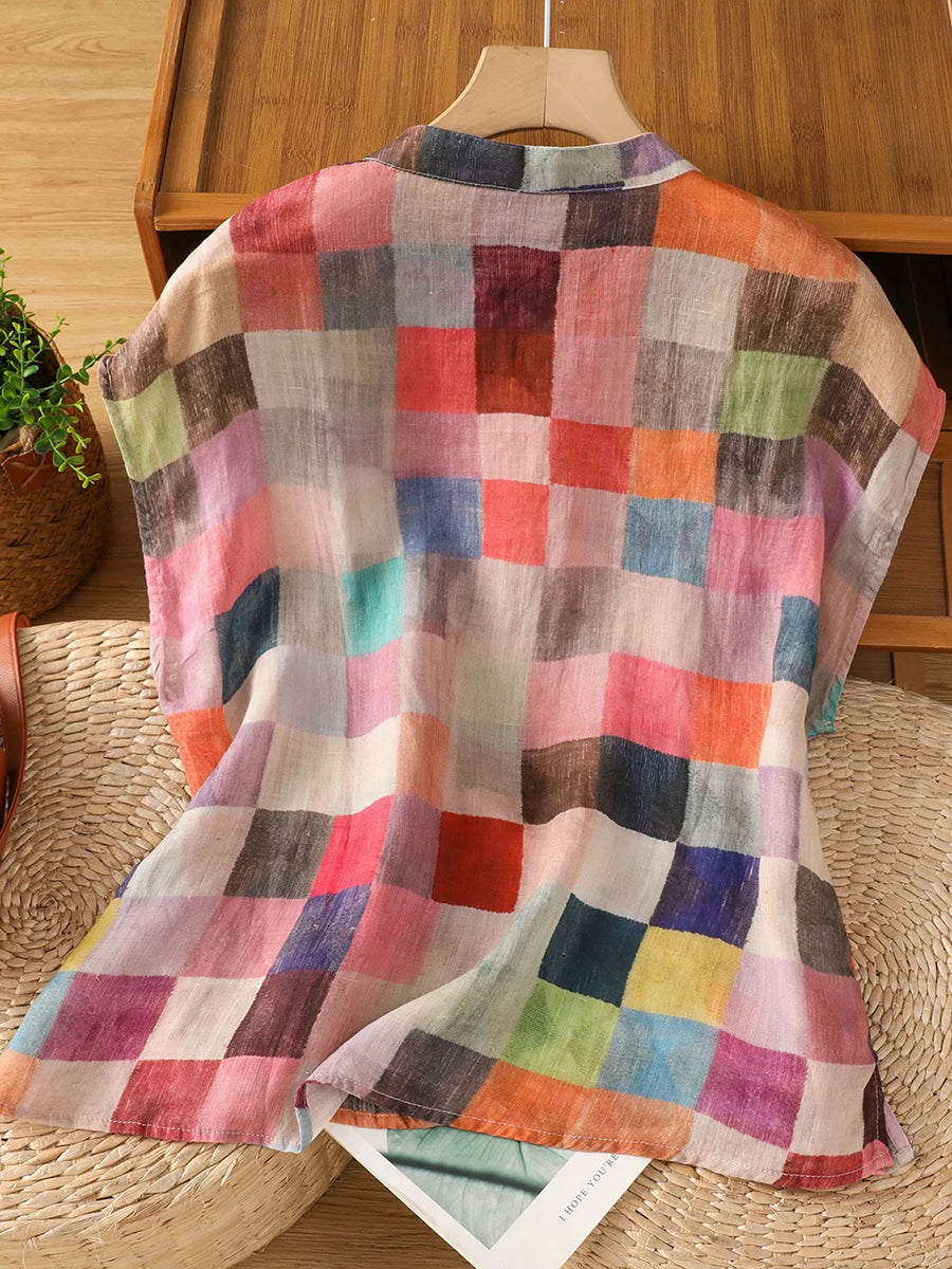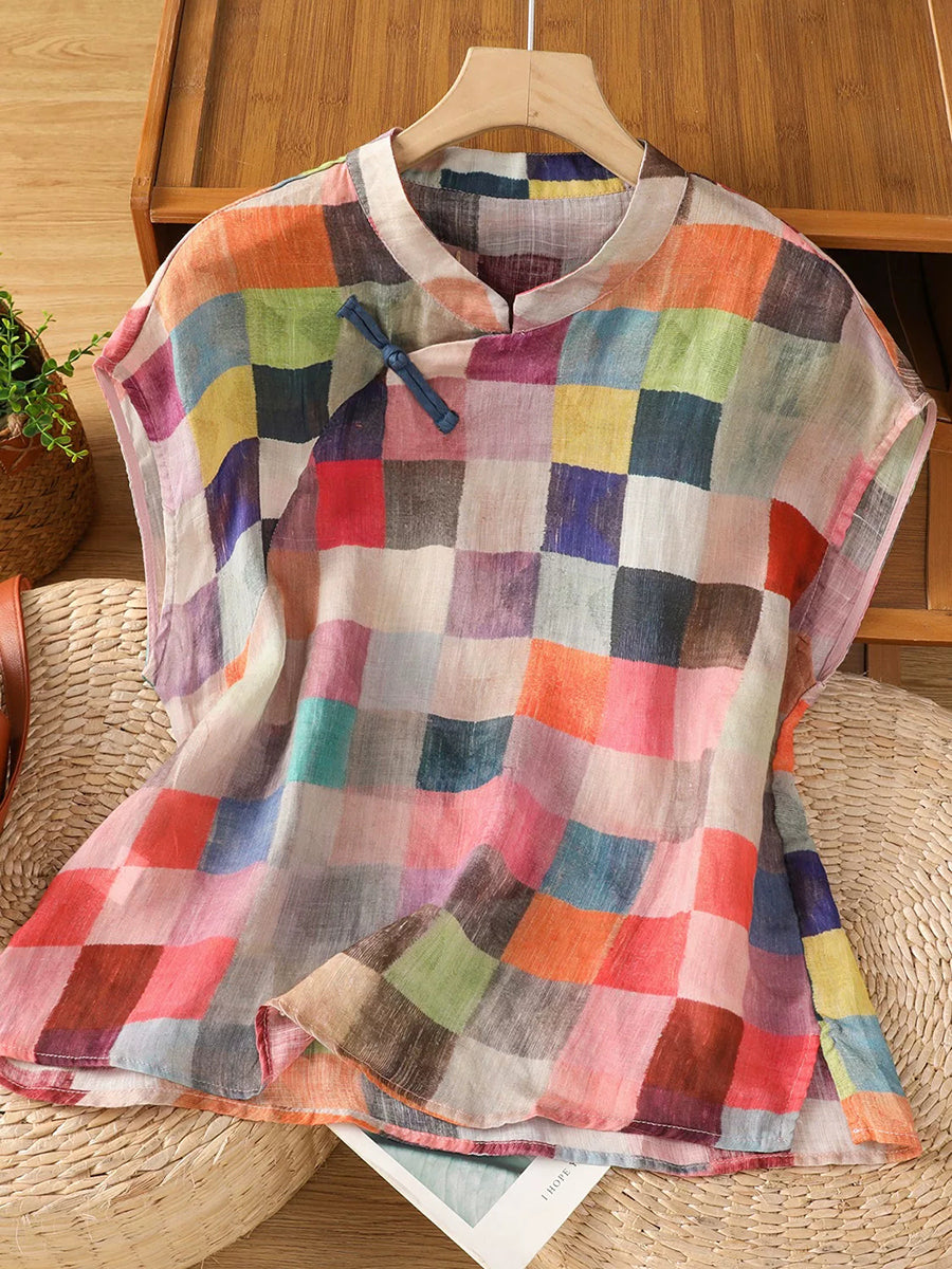 Blusa feminina de verão com estampa xadrez étnica e gola alta.