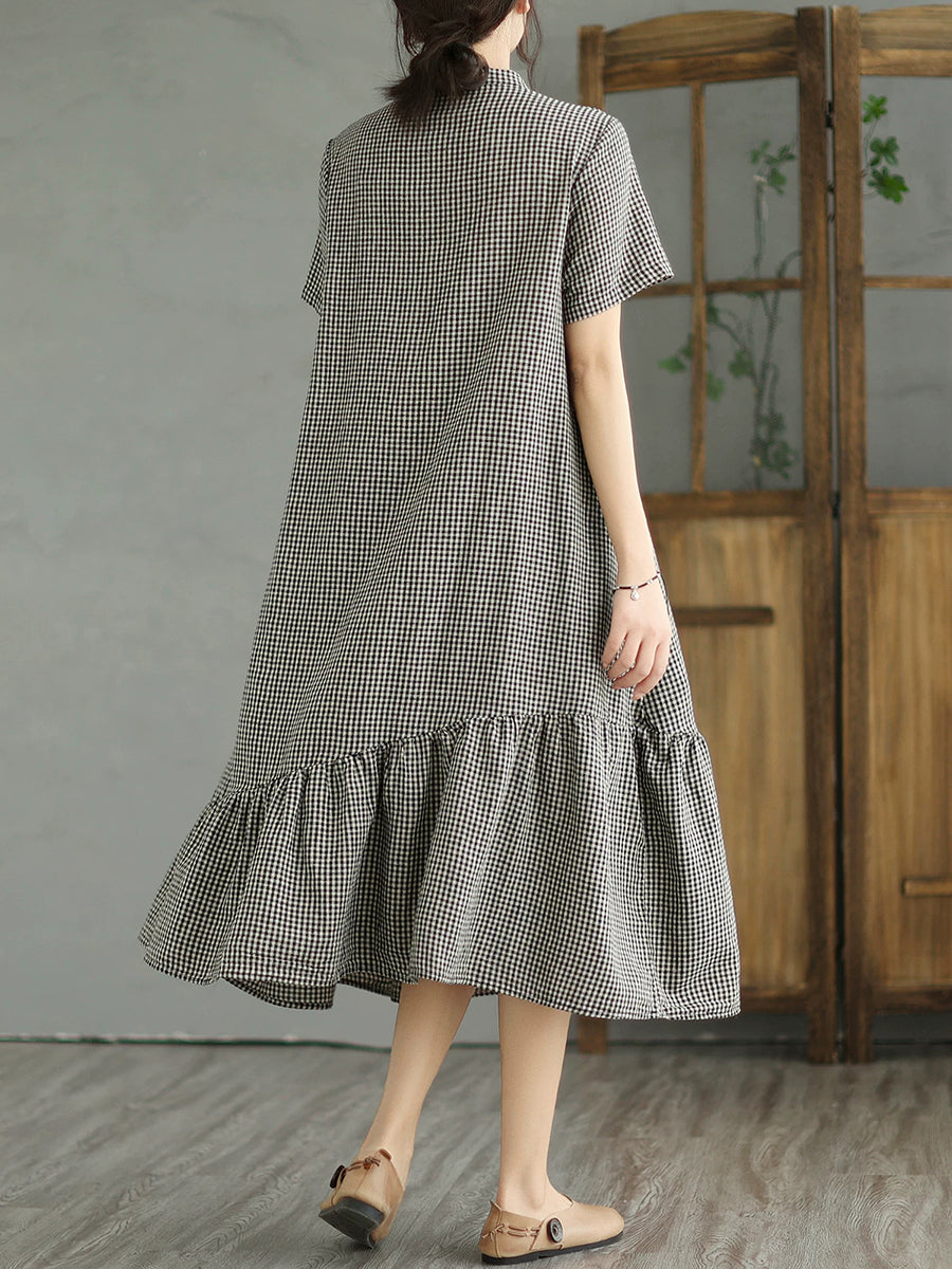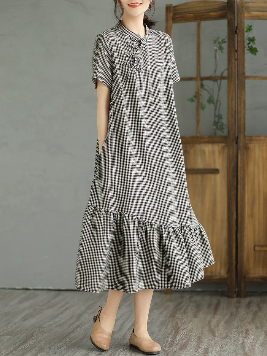 Vestido feminino de verão com estampa xadrez étnica e gola alta.