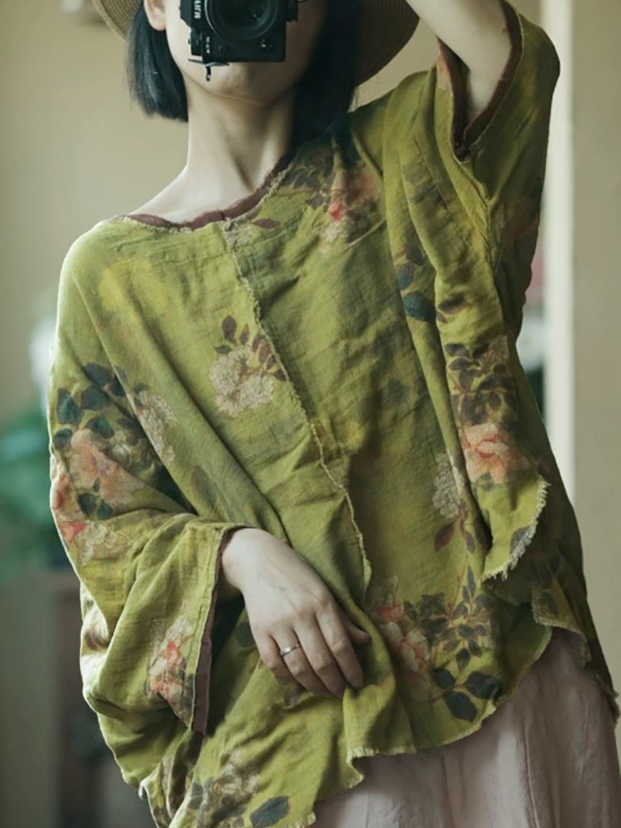 Camisa feminina de verão com estampa floral em algodão e gola redonda