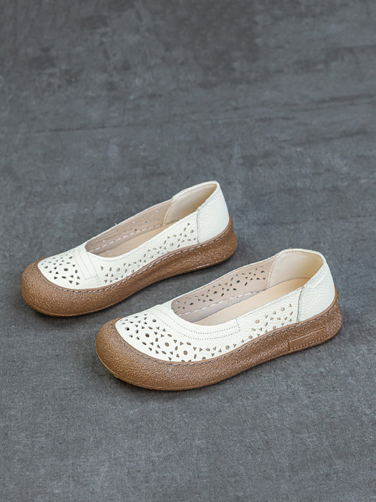 Sapatos femininos de verão em couro legítimo com detalhes vazados