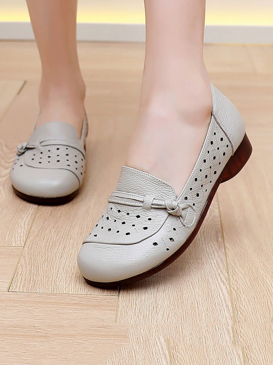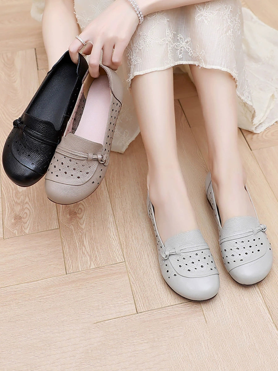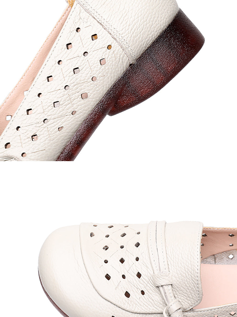 Sapatos femininos de verão com salto baixo em couro legítimo e detalhes vazados