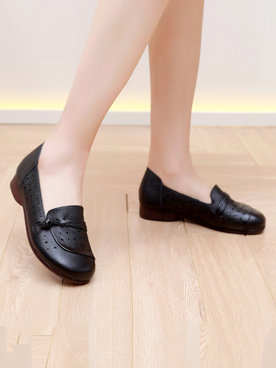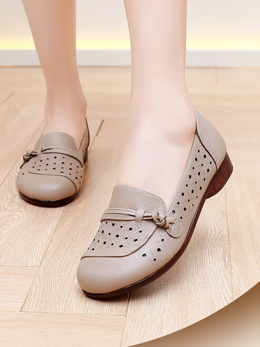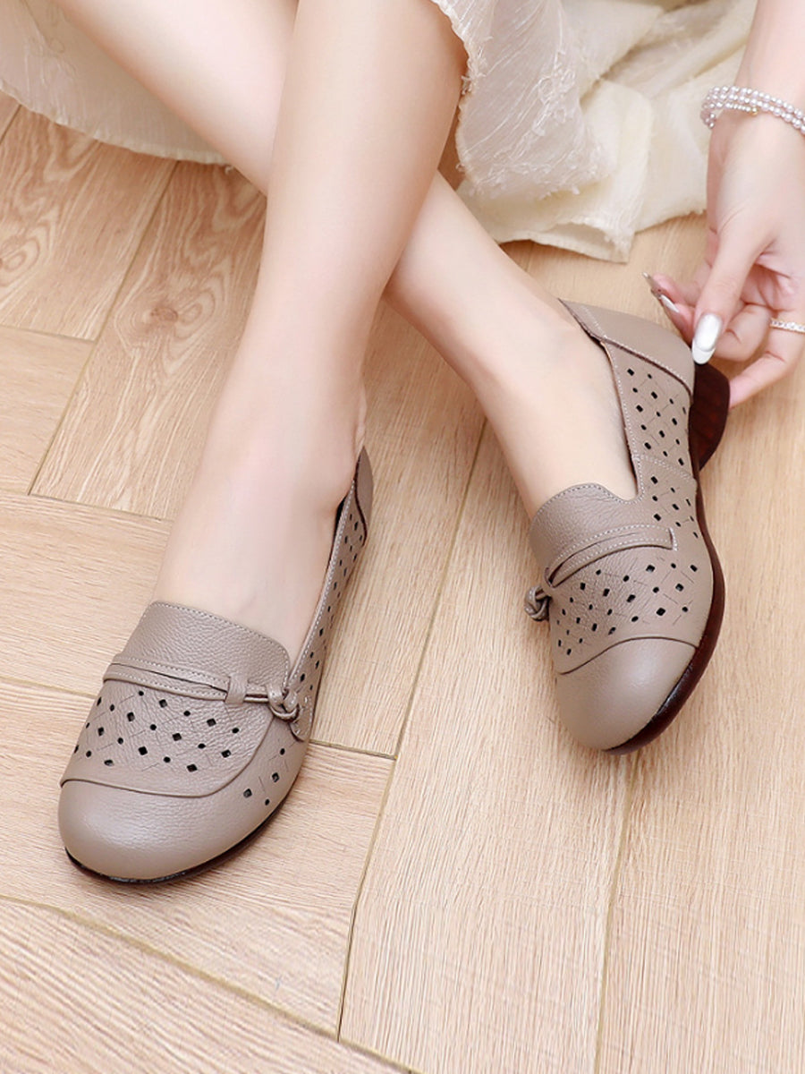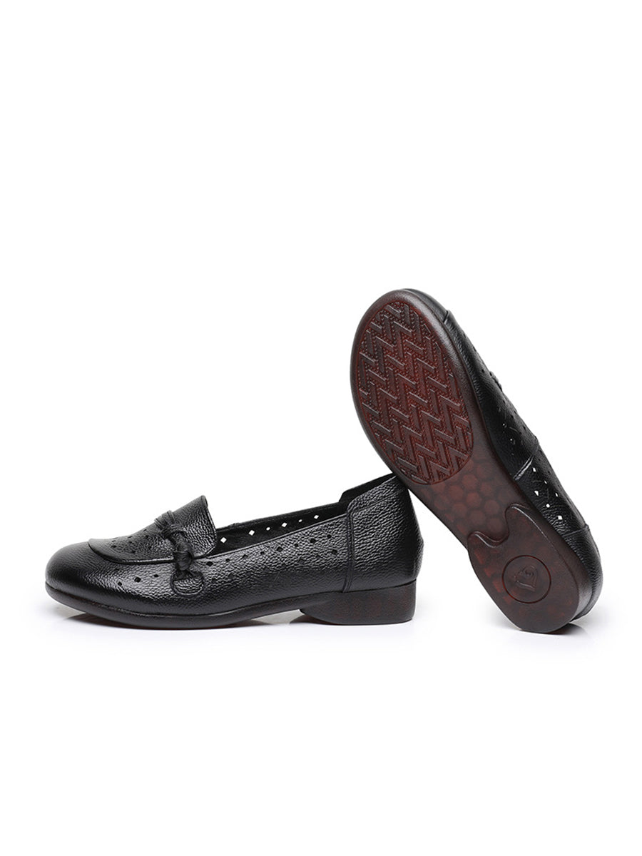 Sapatos femininos de verão com salto baixo em couro legítimo e detalhes vazados