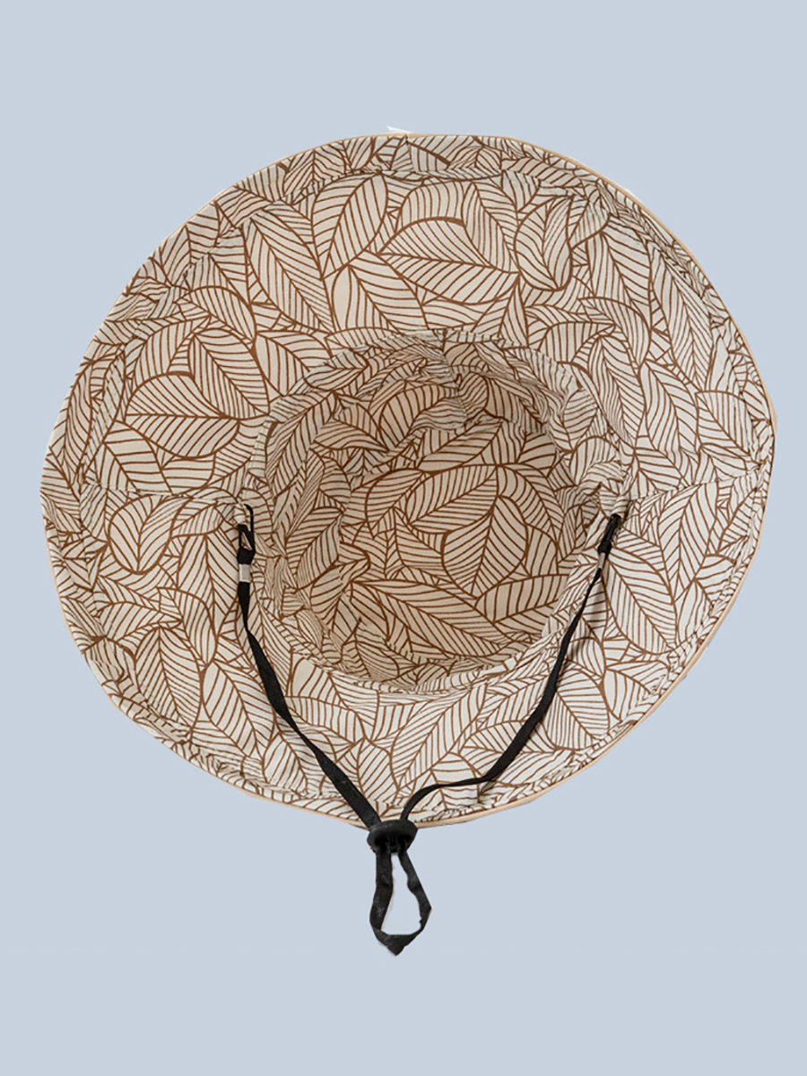 Chapéu feminino de verão com estampa de folhas e proteção solar dupla face.