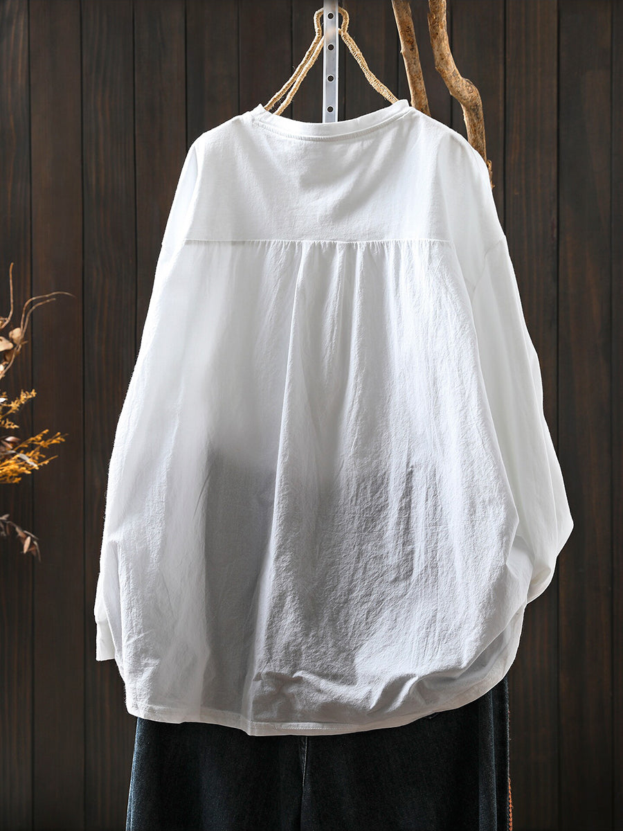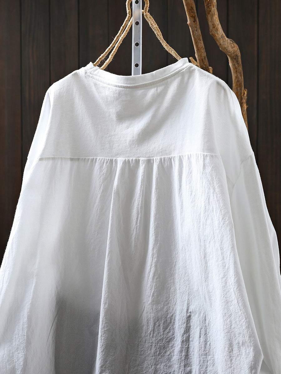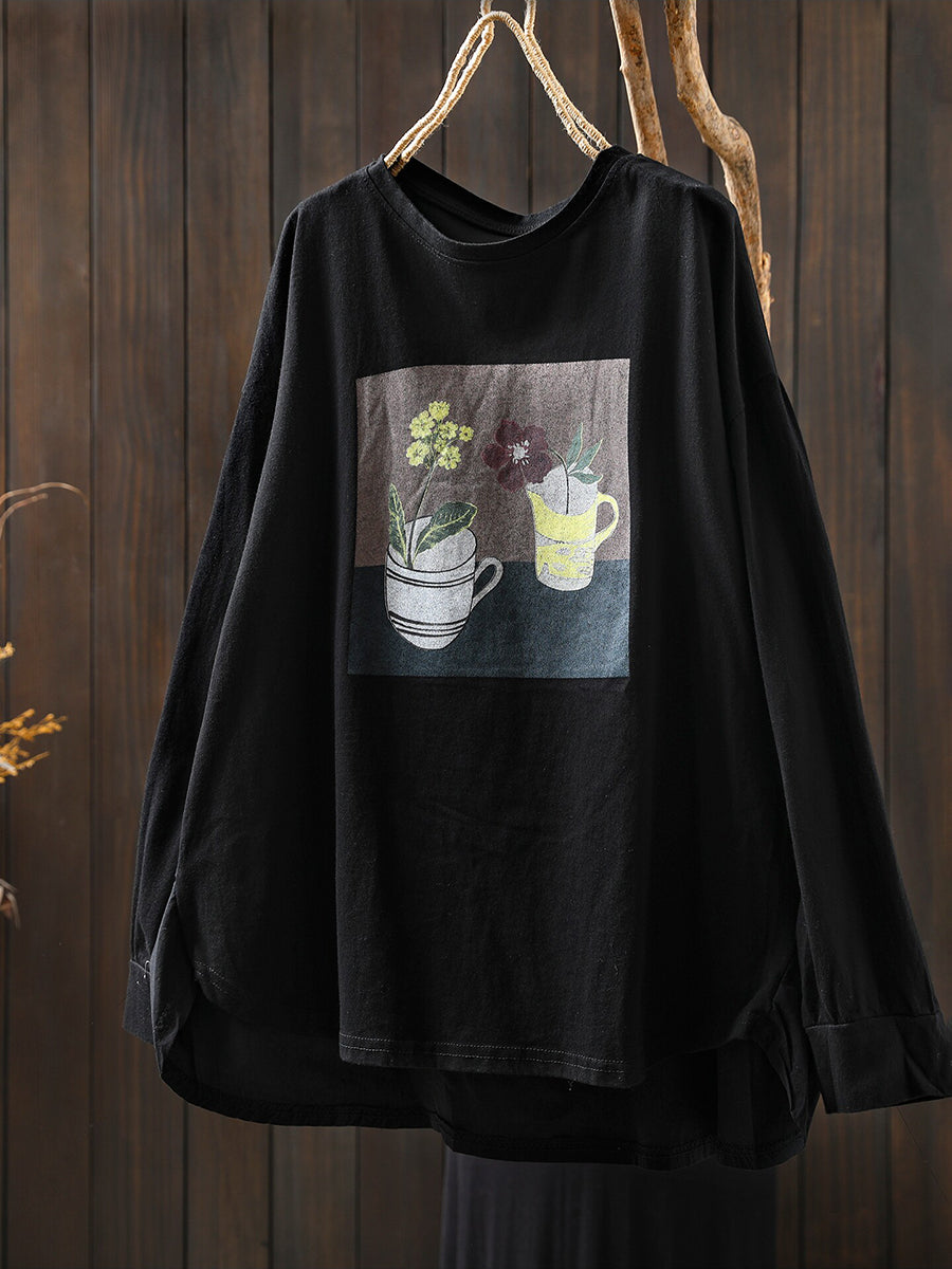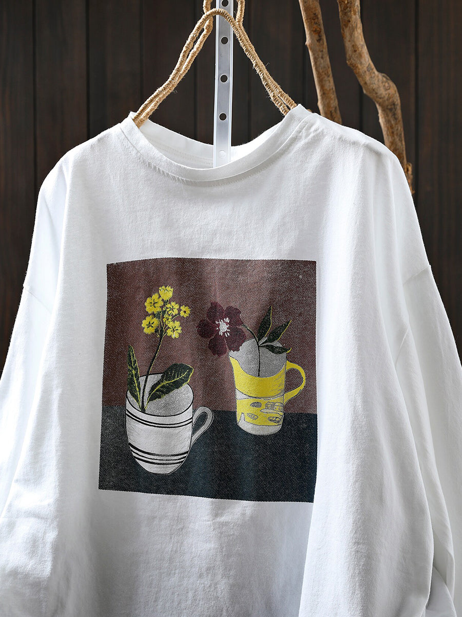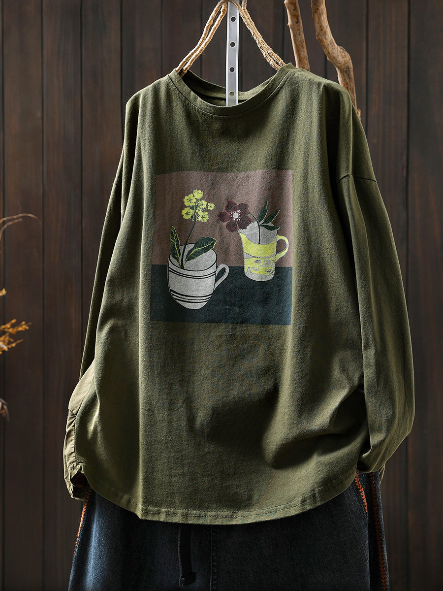Camisa feminina de verão com estampa em algodão e gola redonda