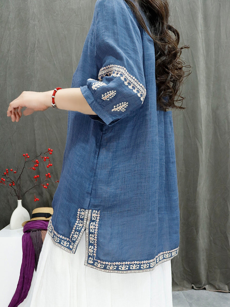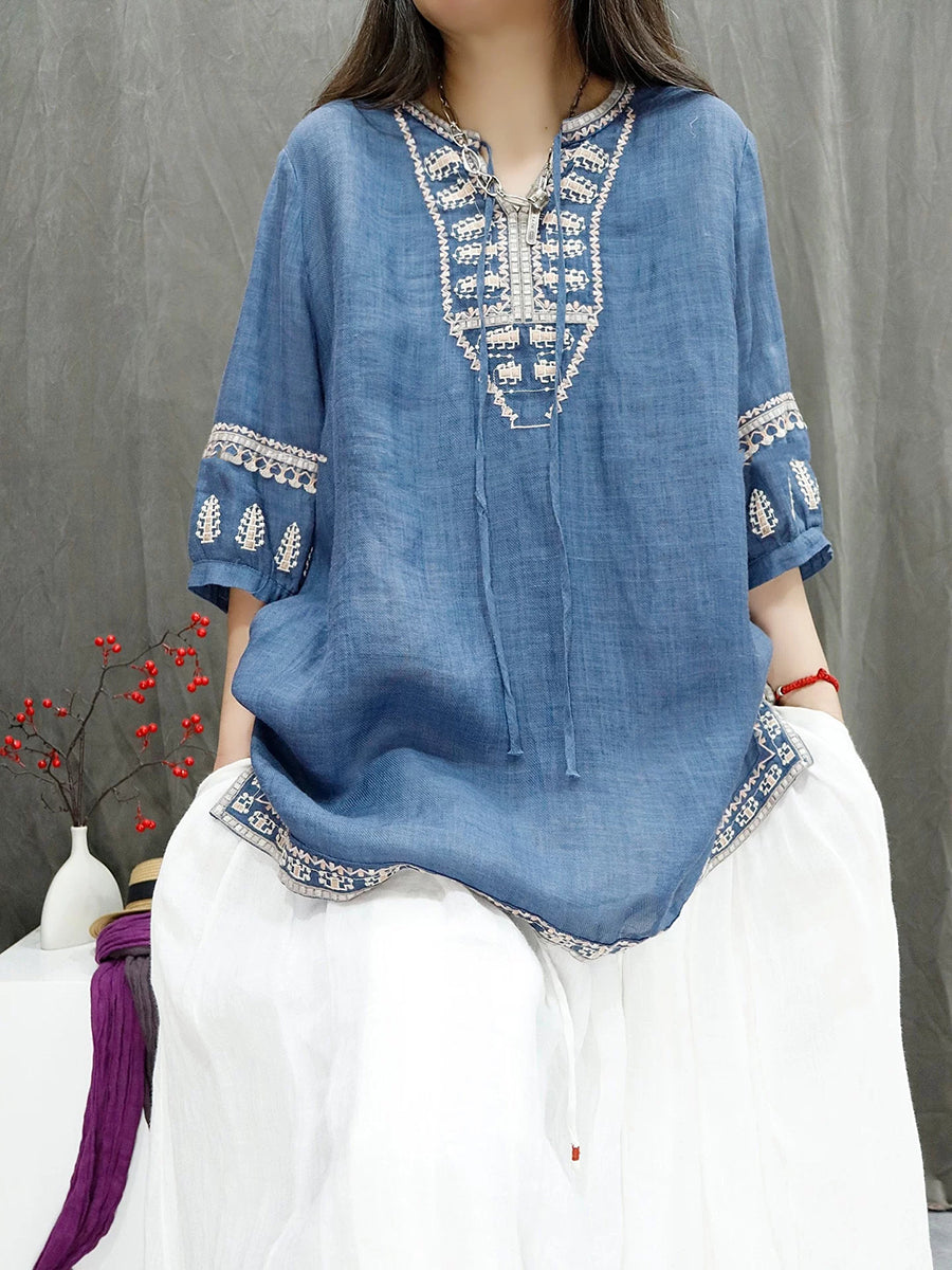 Blusa feminina de verão retrô bordada, 100% rami.