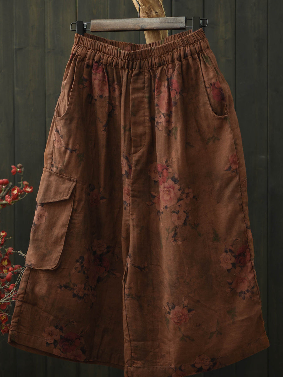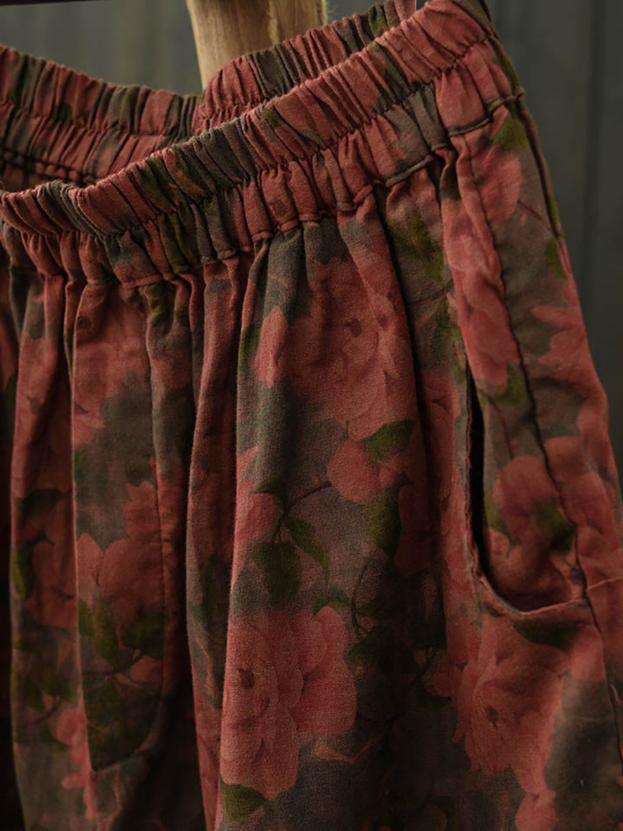Calça feminina de verão retrô com estampa floral e pernas largas em algodão.