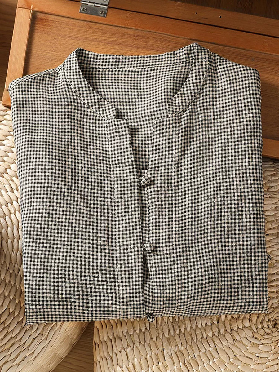 Blusa feminina de verão retrô com gola alta em xadrez