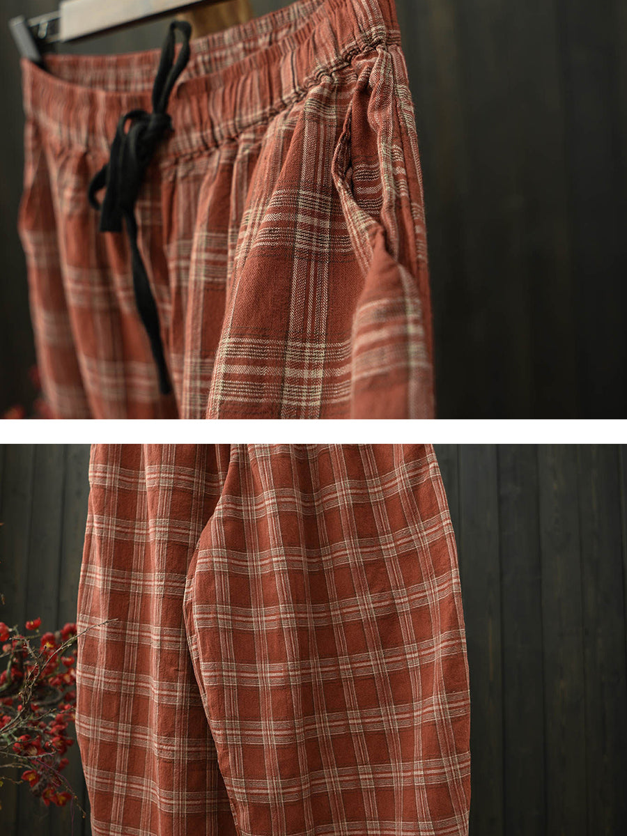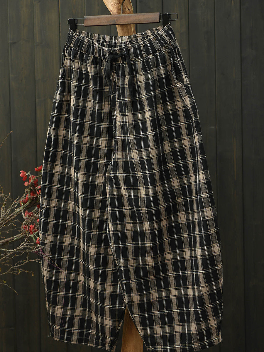 Calça Harem Feminina de Algodão Xadrez Retrô para o Verão
