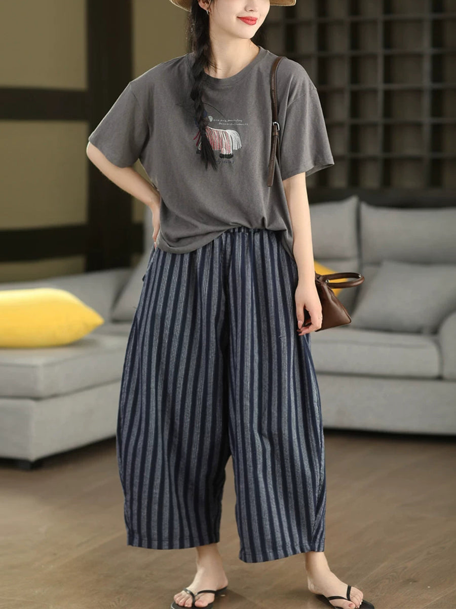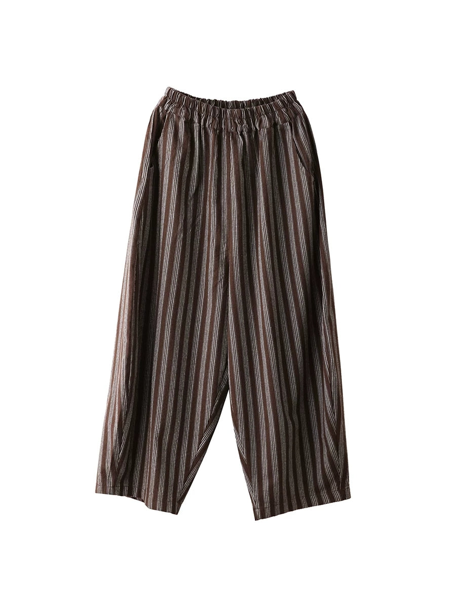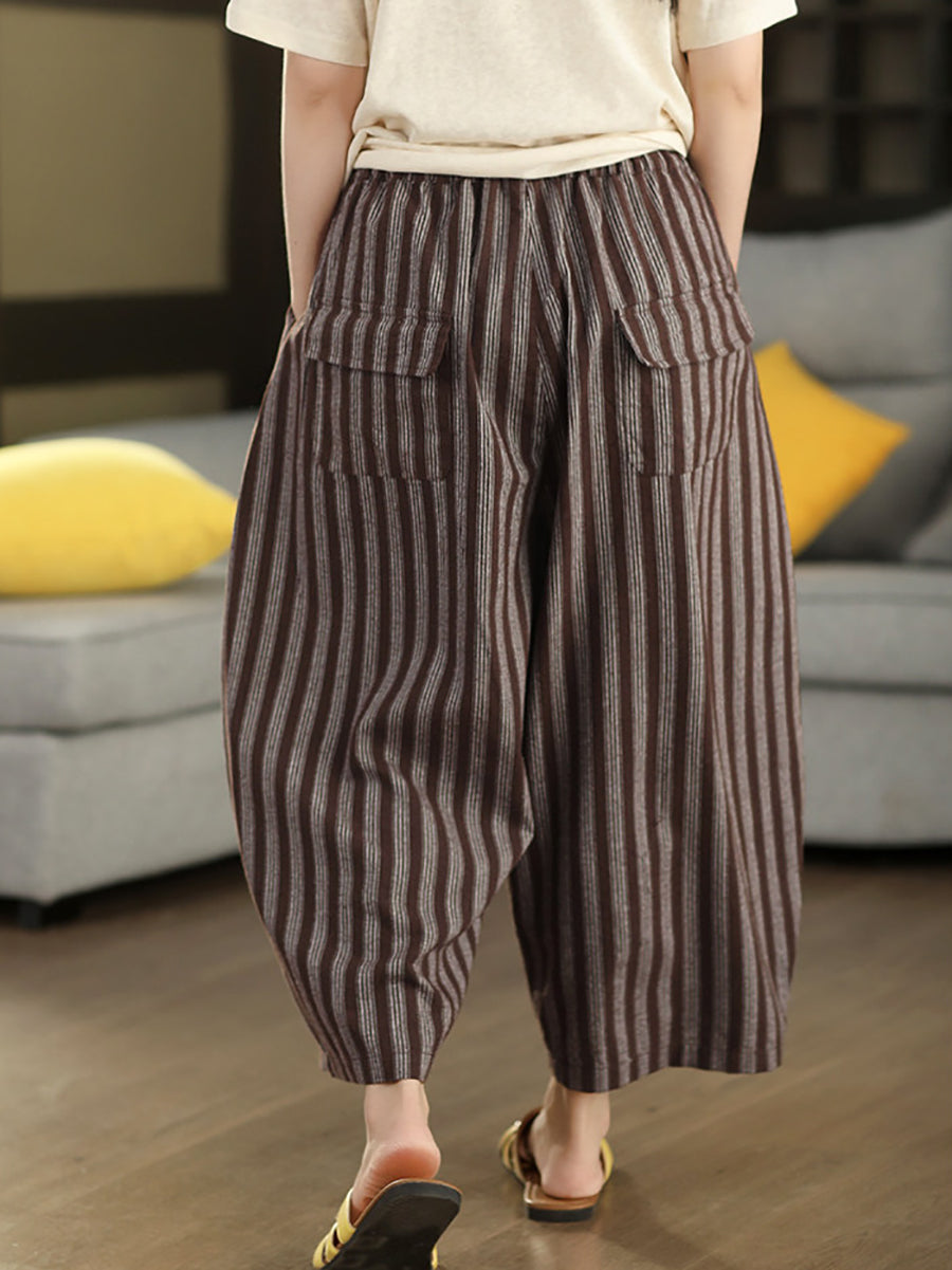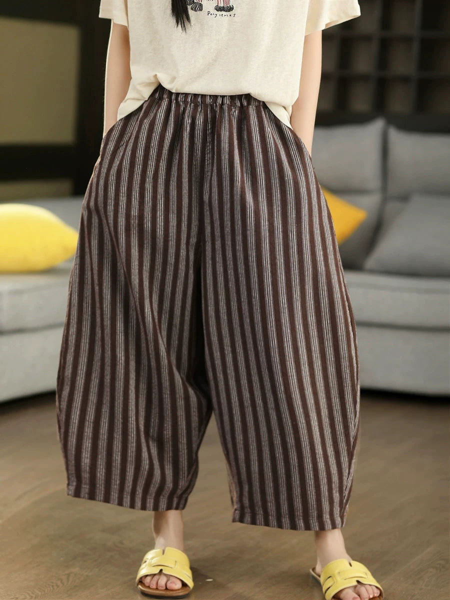 Calça Harem Feminina de Verão com Listras Retrô 100% Linho