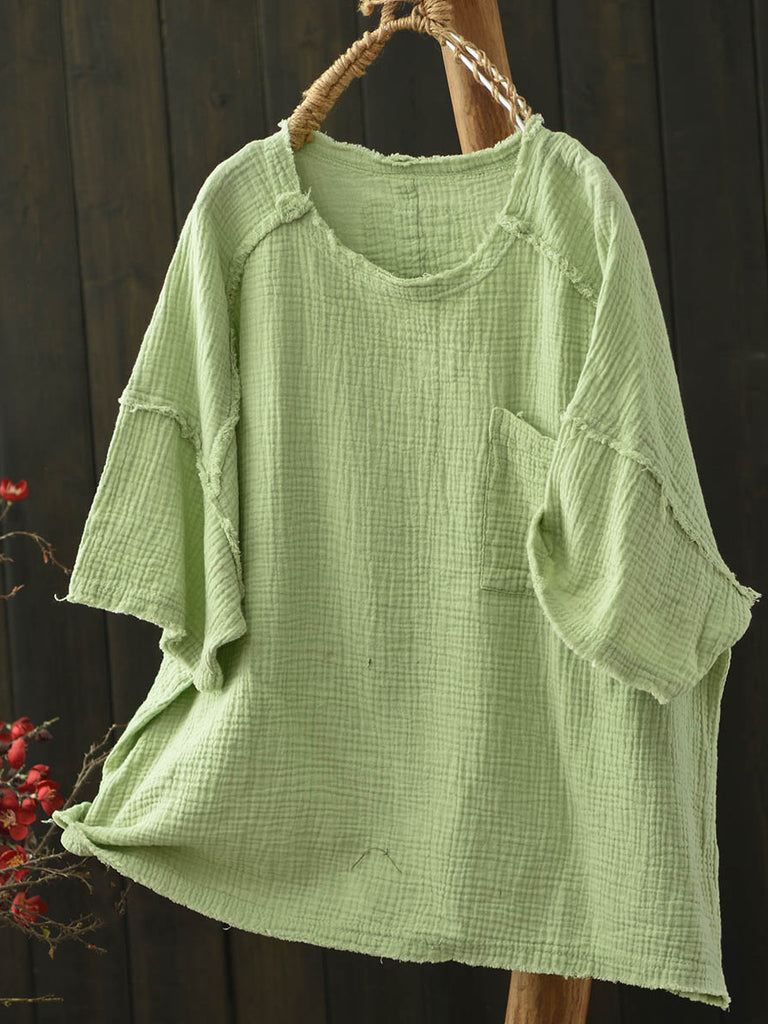 Camisa feminina de algodão com gola redonda e cor pura usada no verão