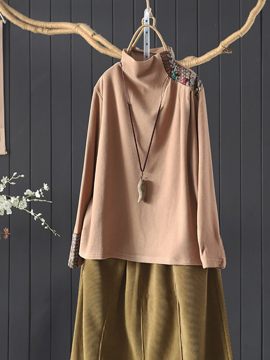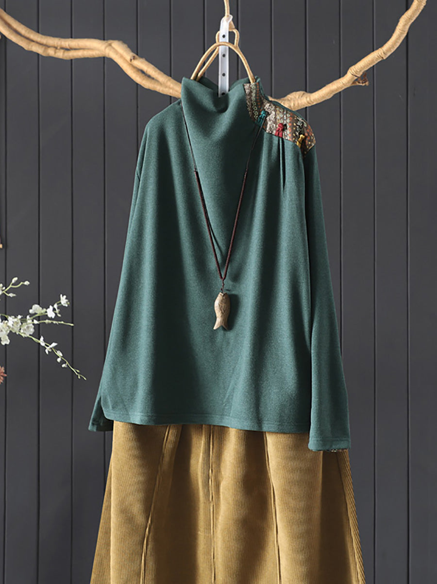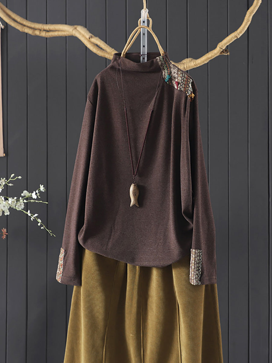 Blusa feminina vintage de gola alta com patchwork para o outono