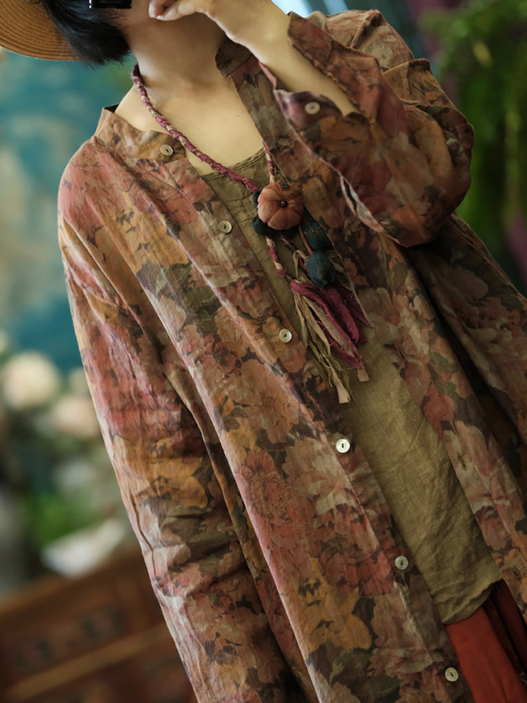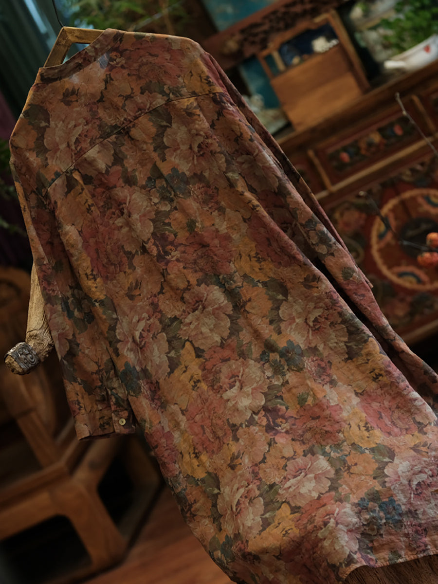 Camisa longa com botões, vintage, floral, retrô, rami, feminina