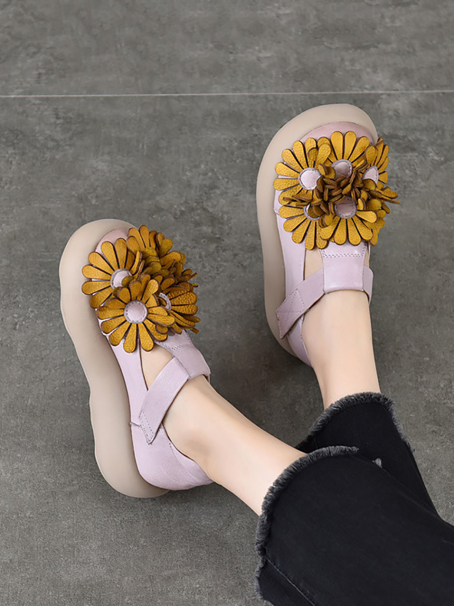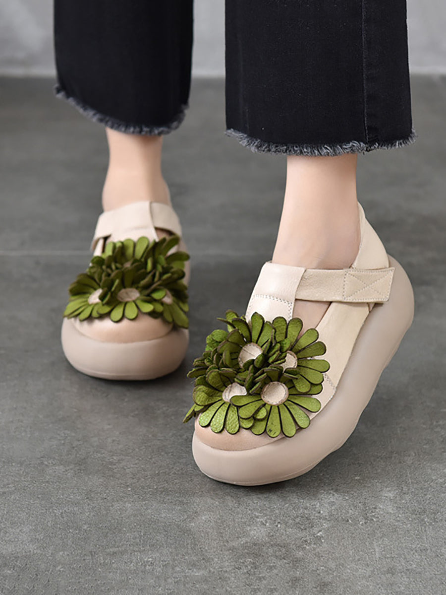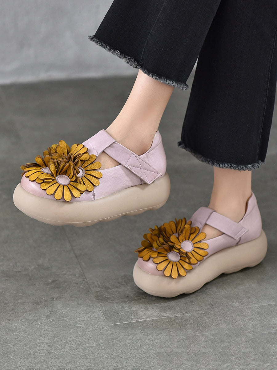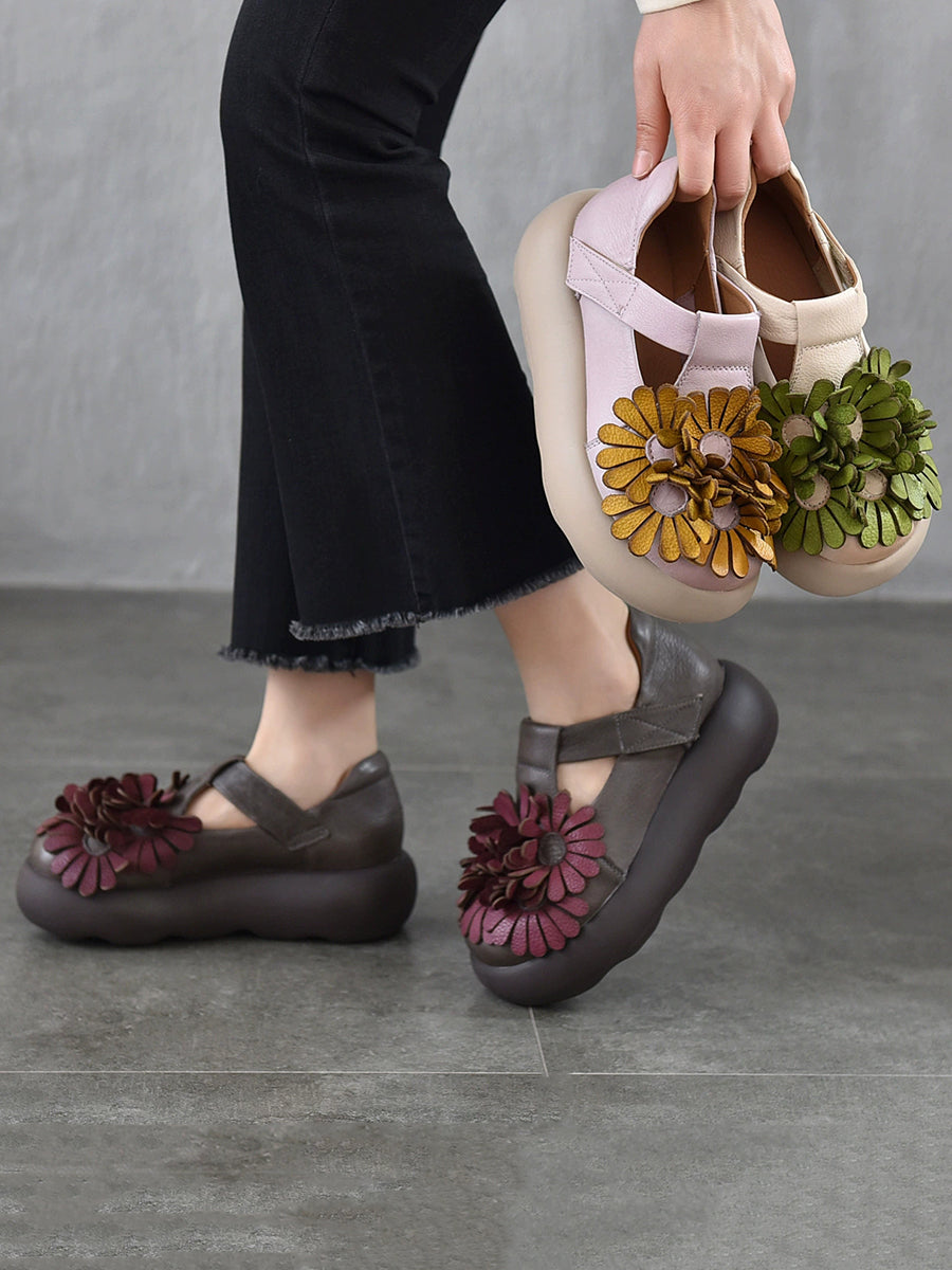 Sapatos plataforma femininos vintage em couro legítimo com estampa floral.