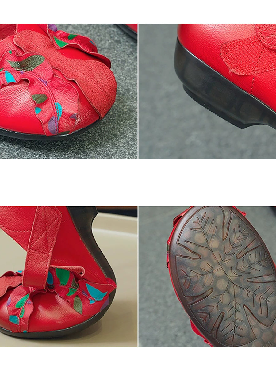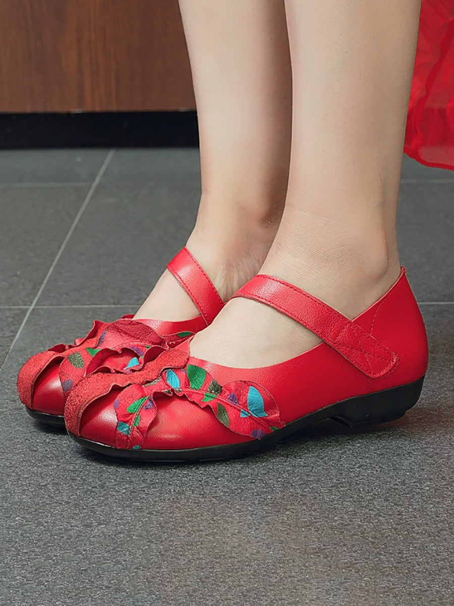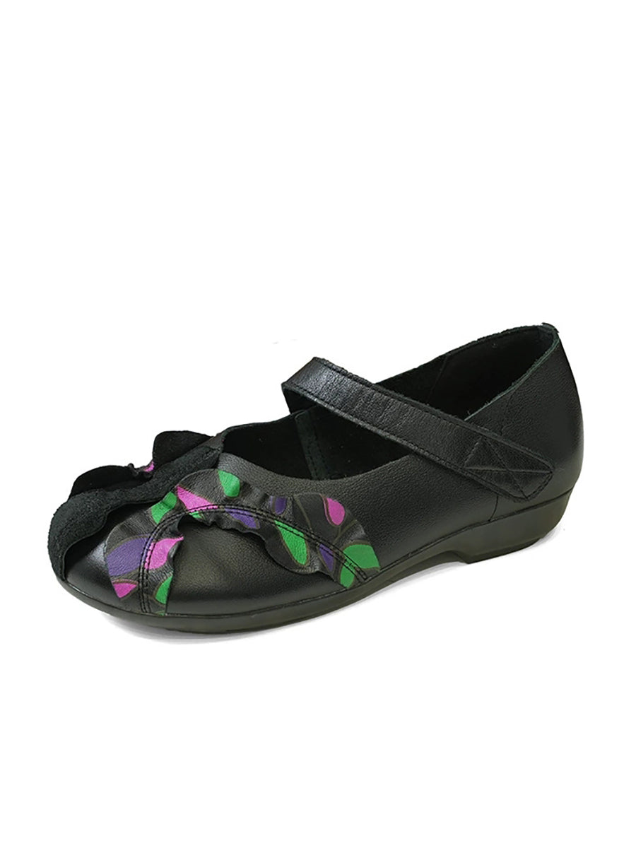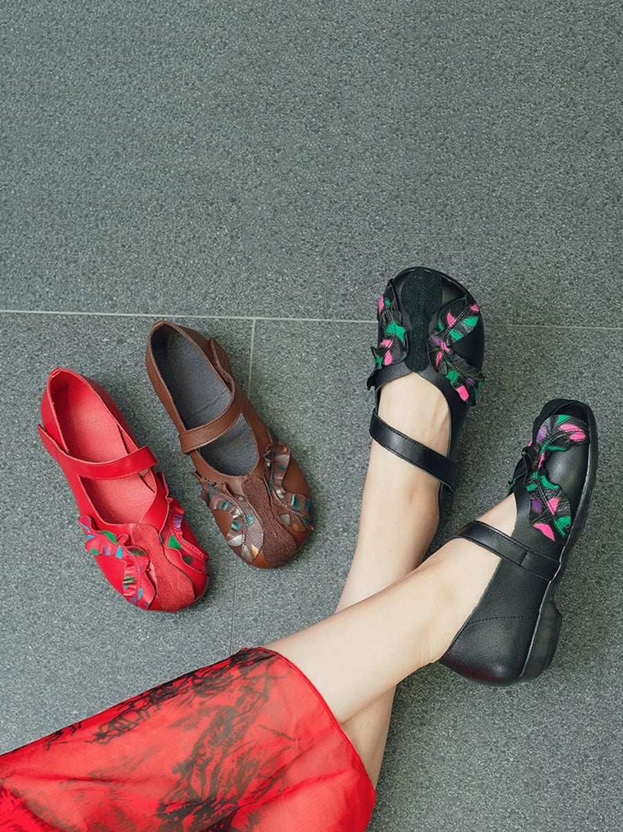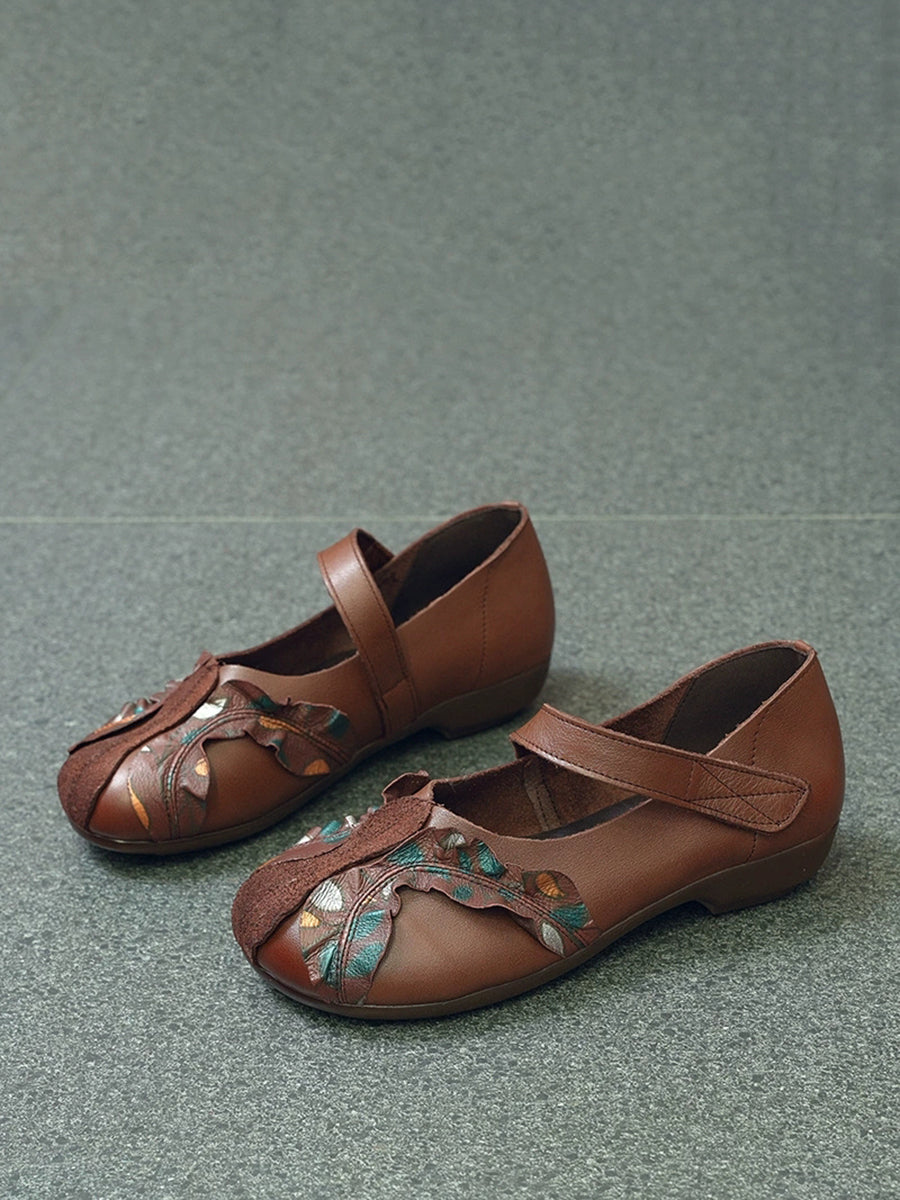 Sapatos femininos vintage de couro genuíno com salto baixo e detalhes em patchwork.