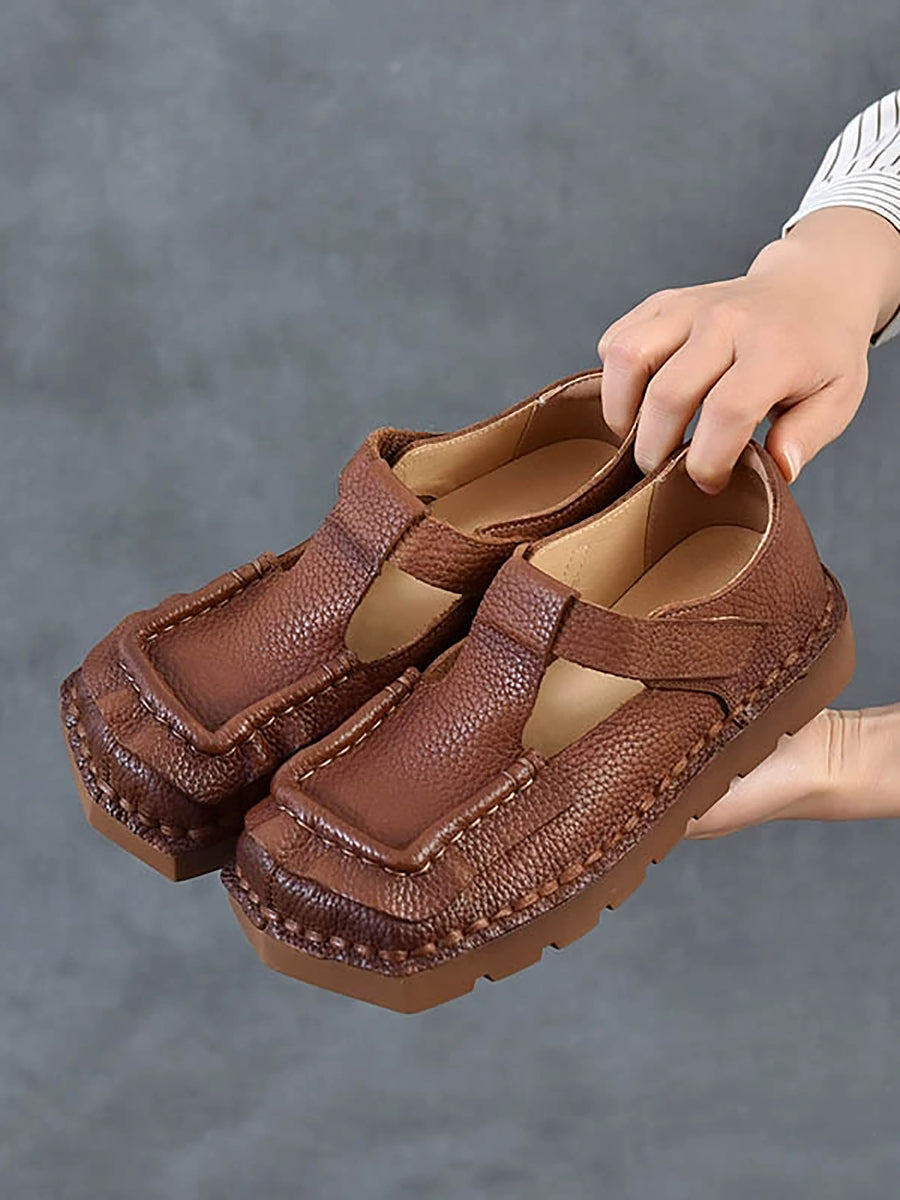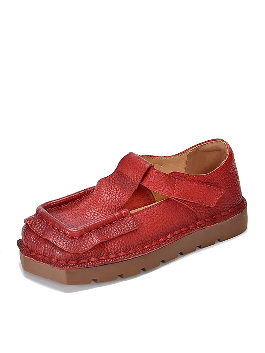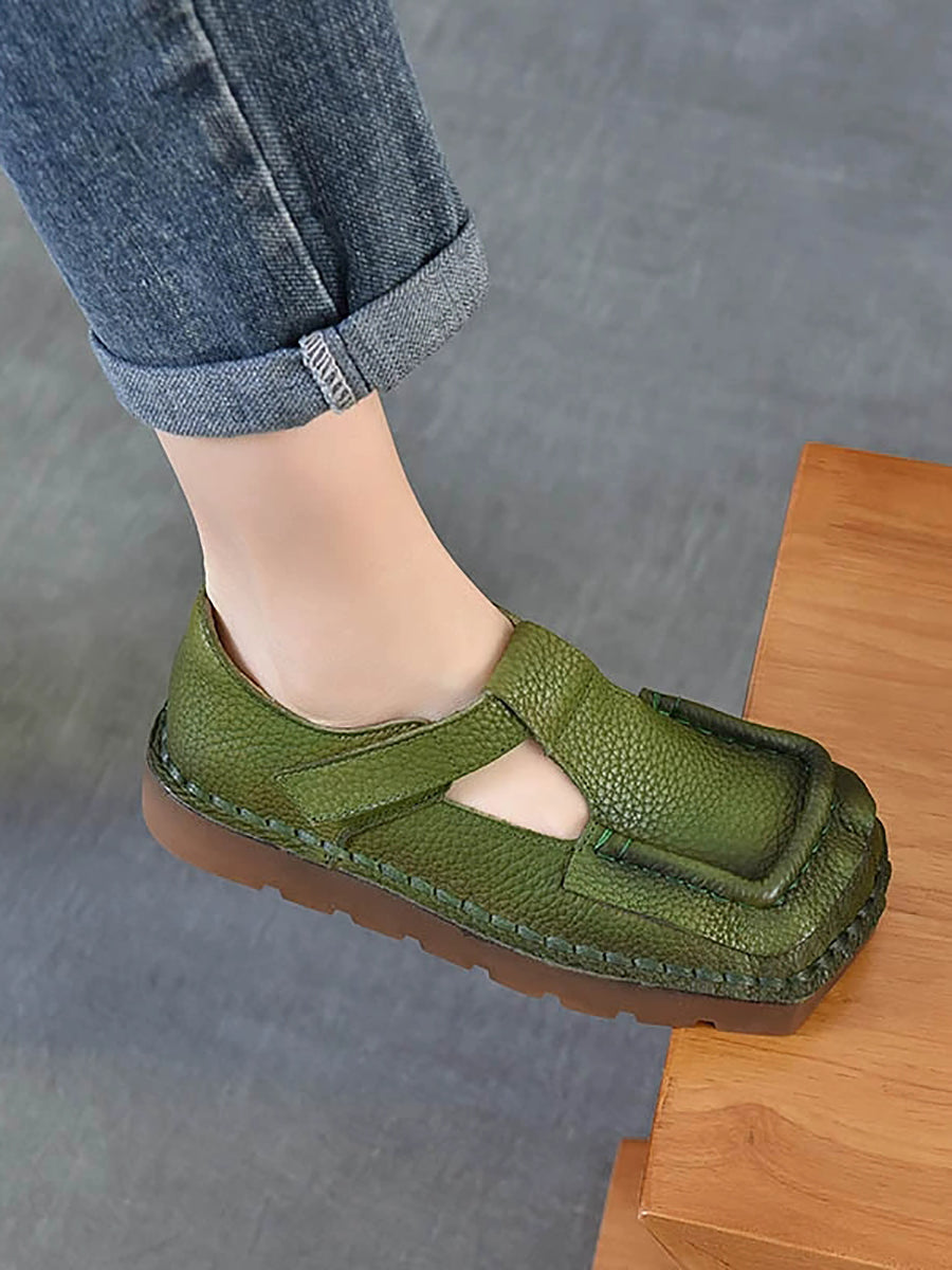 Sapatos femininos vintage de couro legítimo com bico quadrado
