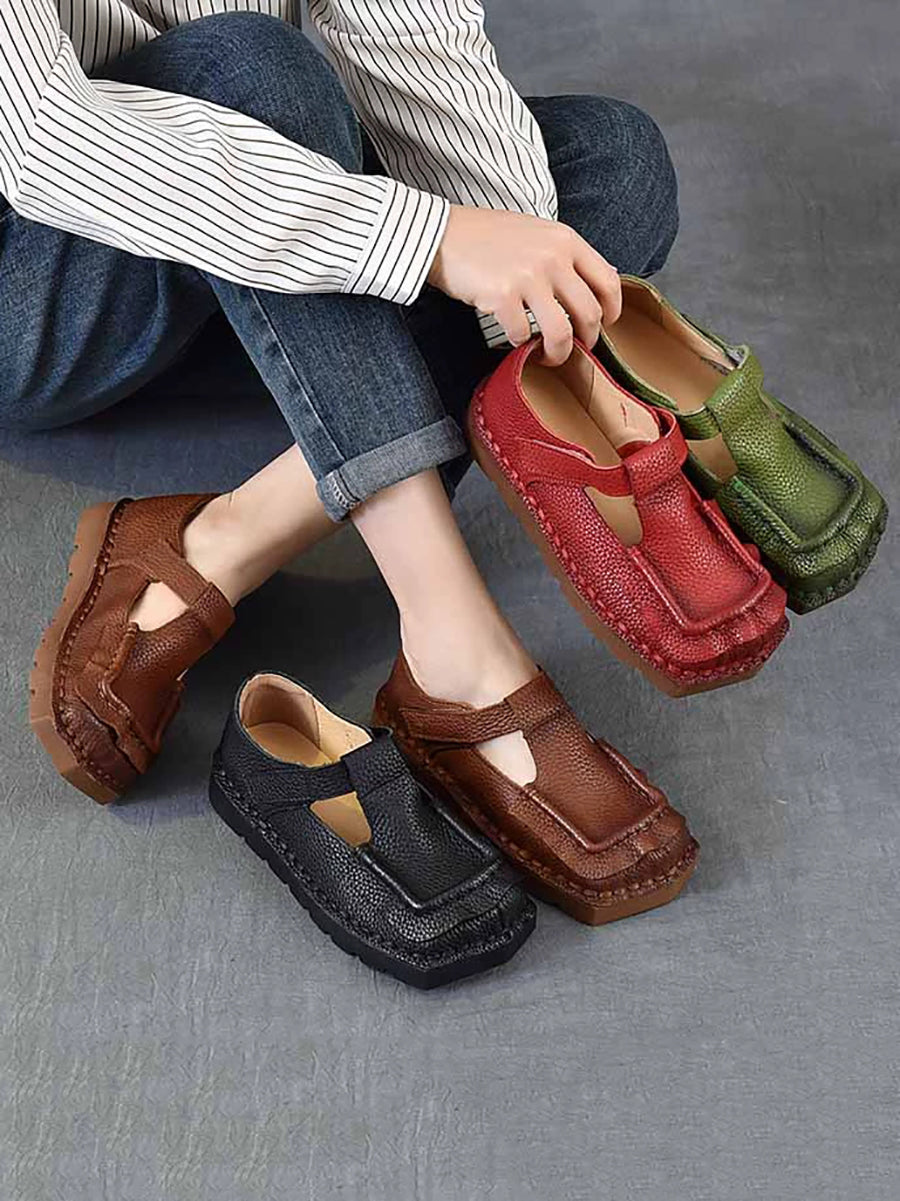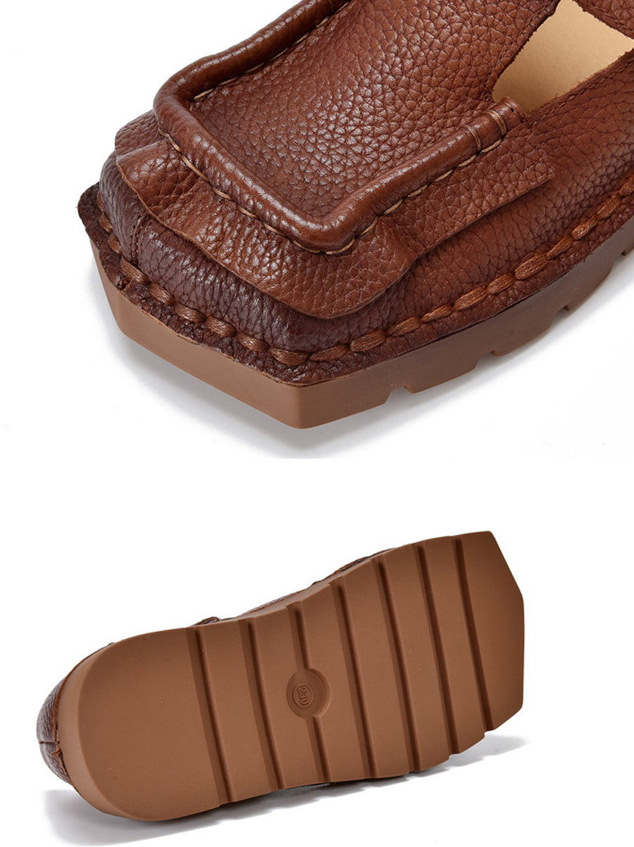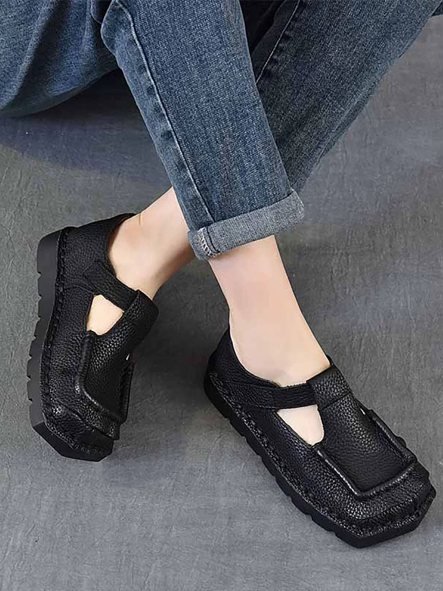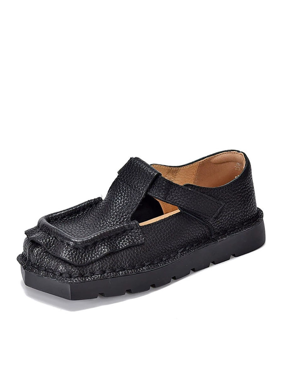 Sapatos femininos vintage de couro legítimo com bico quadrado
